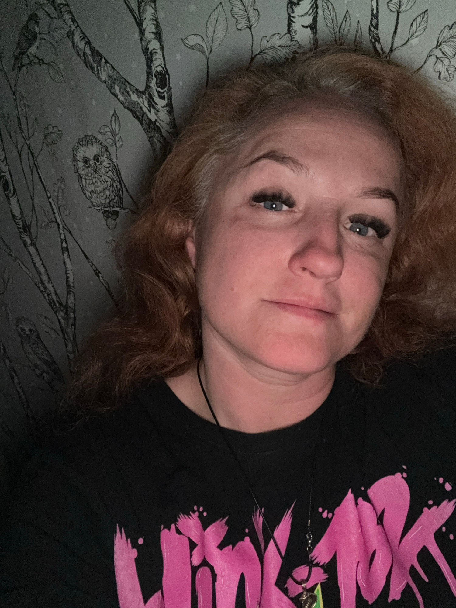 A woman with light skin and reddish-brown hair is lying on a surface with a muted green and grey pattern resembling a tree with an owl. She is wearing a black t-shirt with pink graphic elements. She h…read more