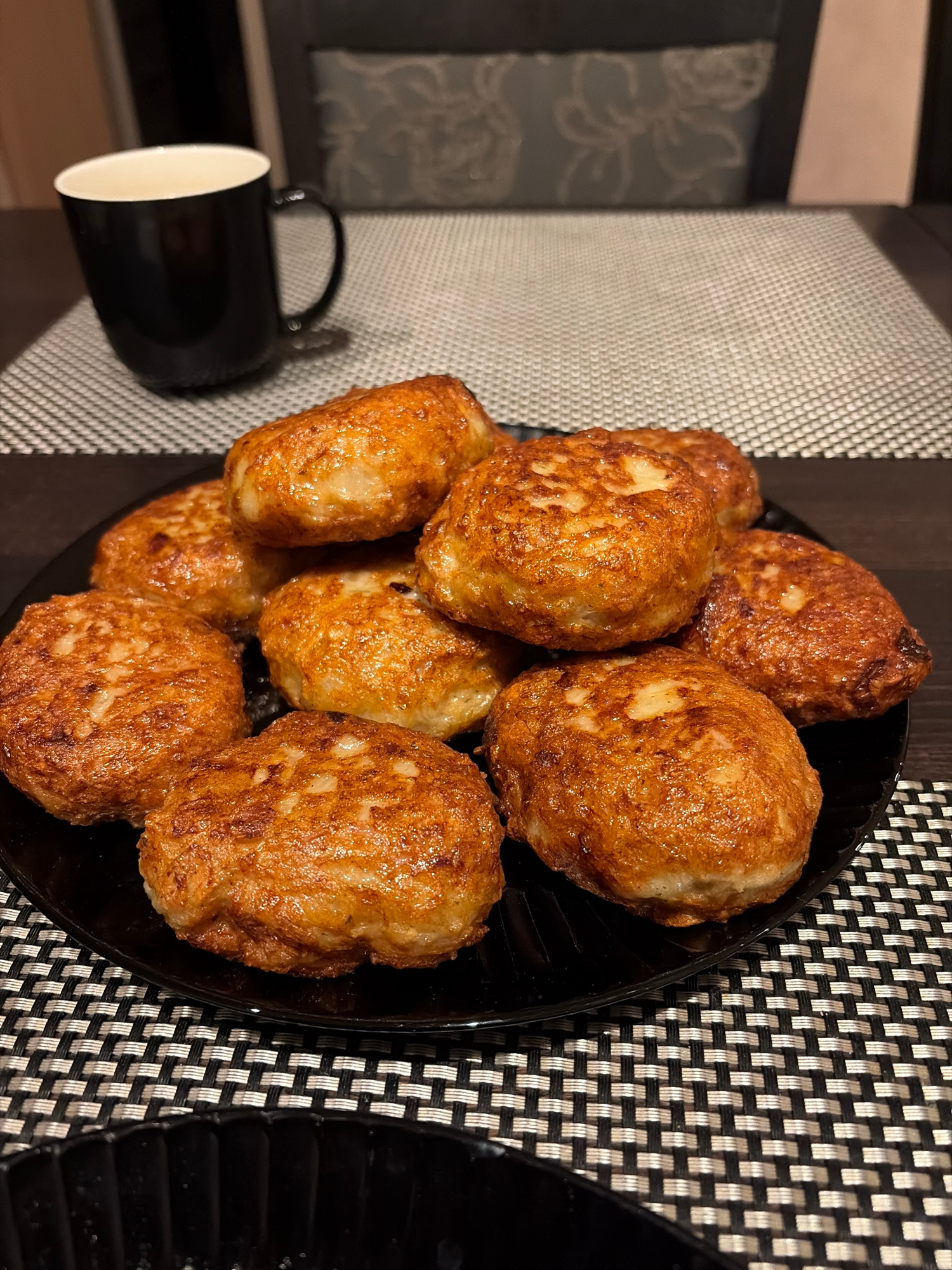 A black plate piled with golden-brown, spherical food items, possibly fried meatballs or croquettes, sits on a patterned placemat of alternating black and white squares. The placemat is placed on a da…read more