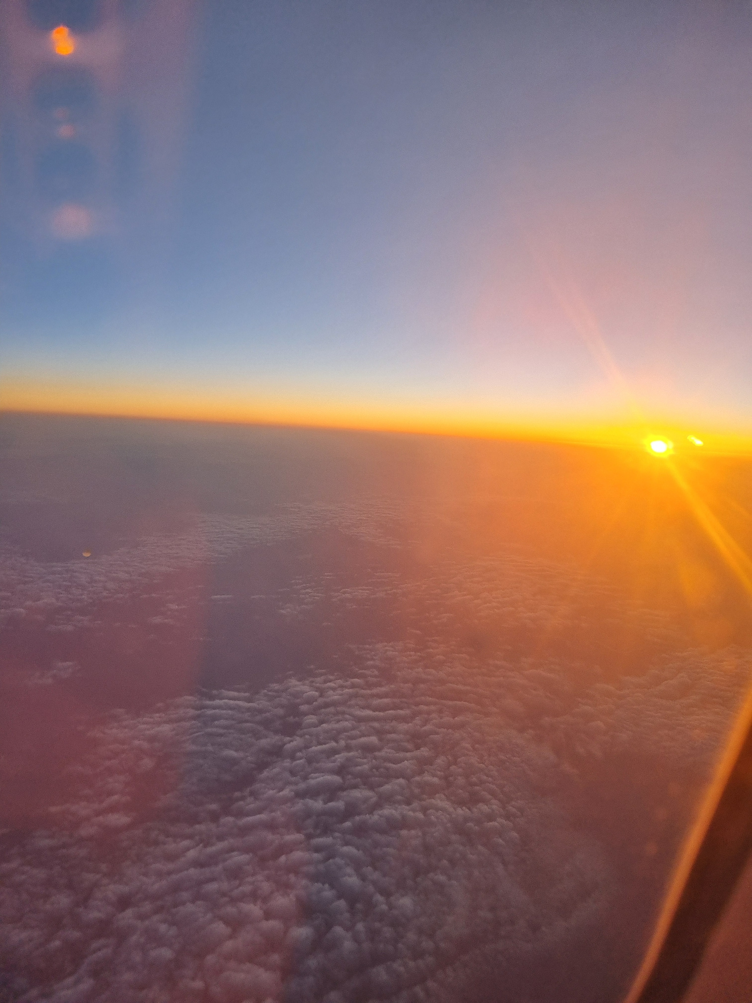 The image shows the Earth's curvature and atmosphere at sunrise, likely taken from an airplane window. The sun is positioned on the upper left, causing a bright glare. A layer of clouds is visible onβ¦read more