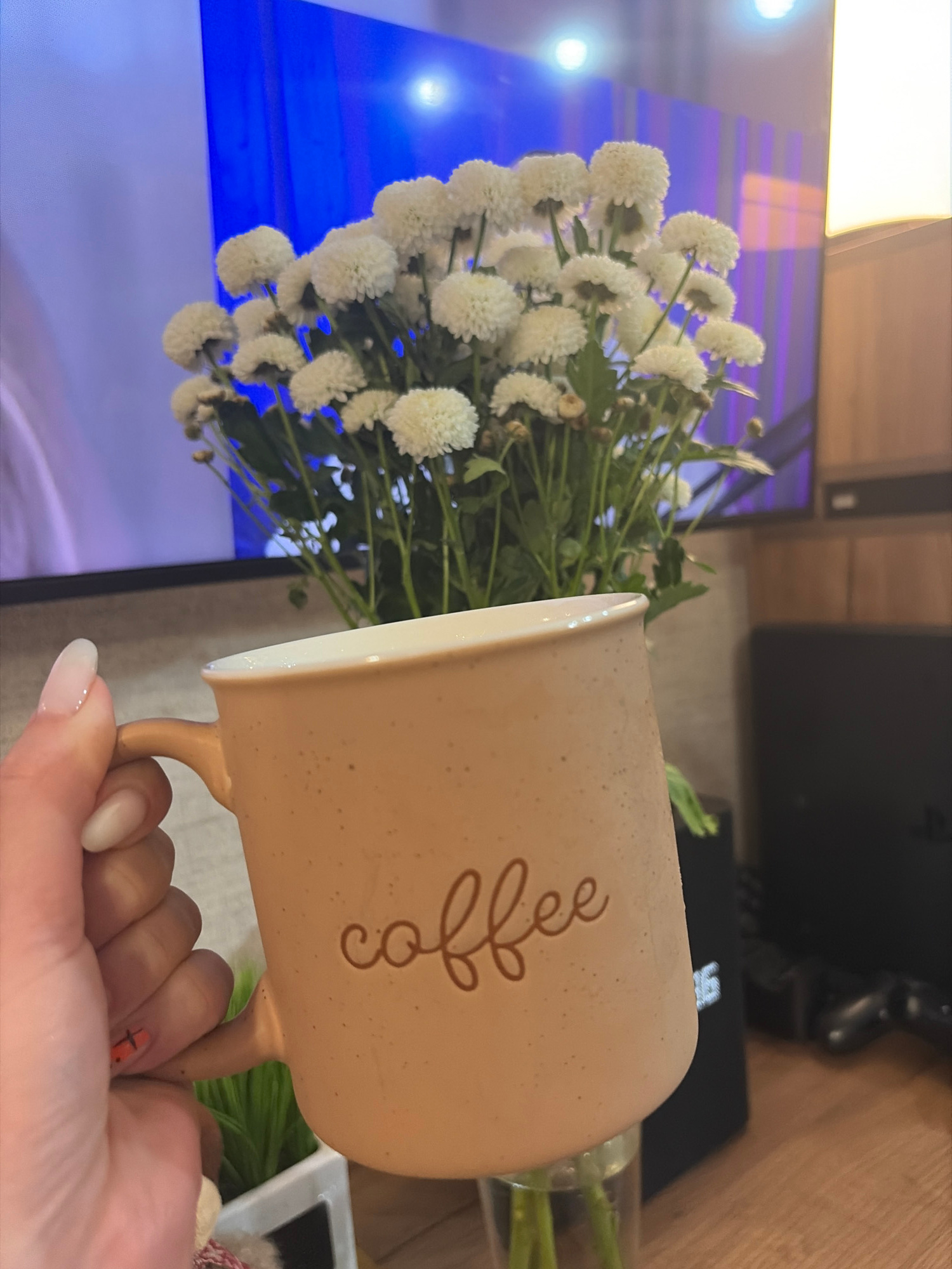A close-up, angled shot shows a bouquet of white flowers and a beige coffee mug being held in a person's hand. The mug has the word "coffee" vertically inscribed on it. The person's hand is visible, w…read more