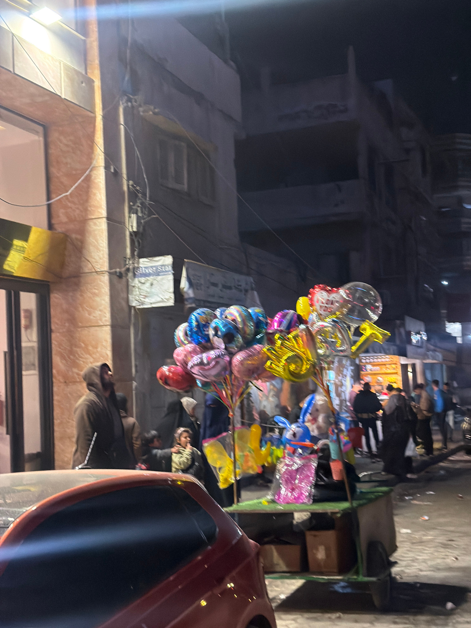 The image shows a street scene in Gaza City, Palestinian Territory at night. A balloon vendor stands on the sidewalk with a large bunch of colorful balloons, including letter-shaped balloons. People a…read more