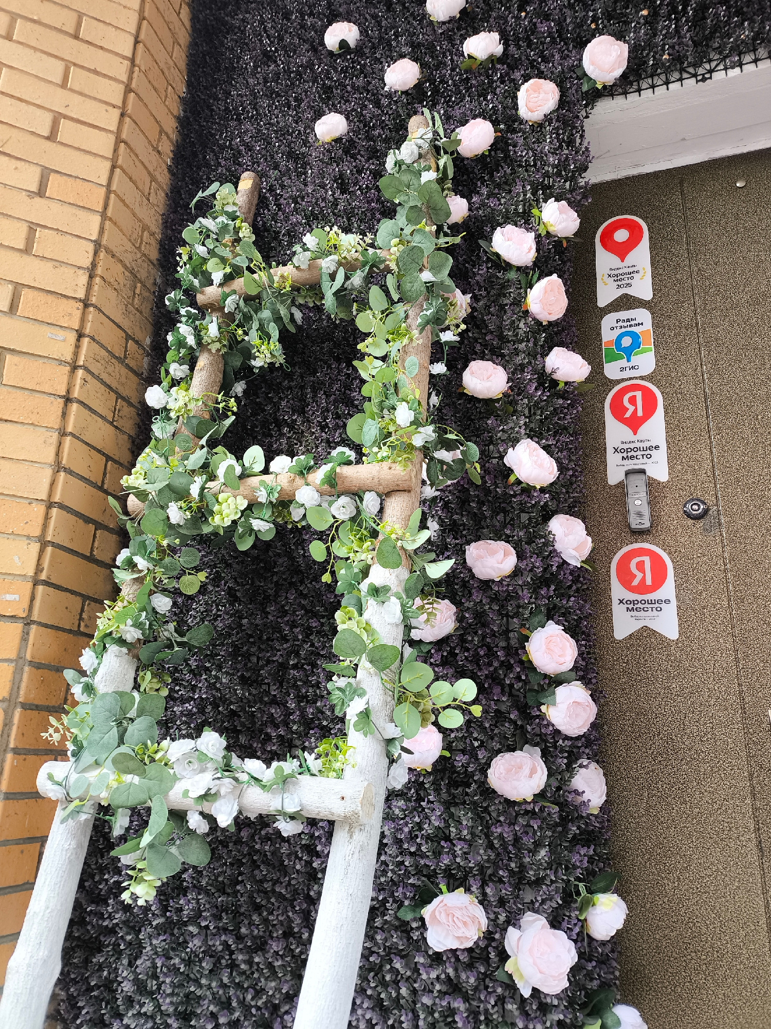 Here's a detailed description of the image: **Scene:** The image shows an exterior decoration next to a brick building. The decoration consists of a wooden ladder adorned with white and green foliage…read more