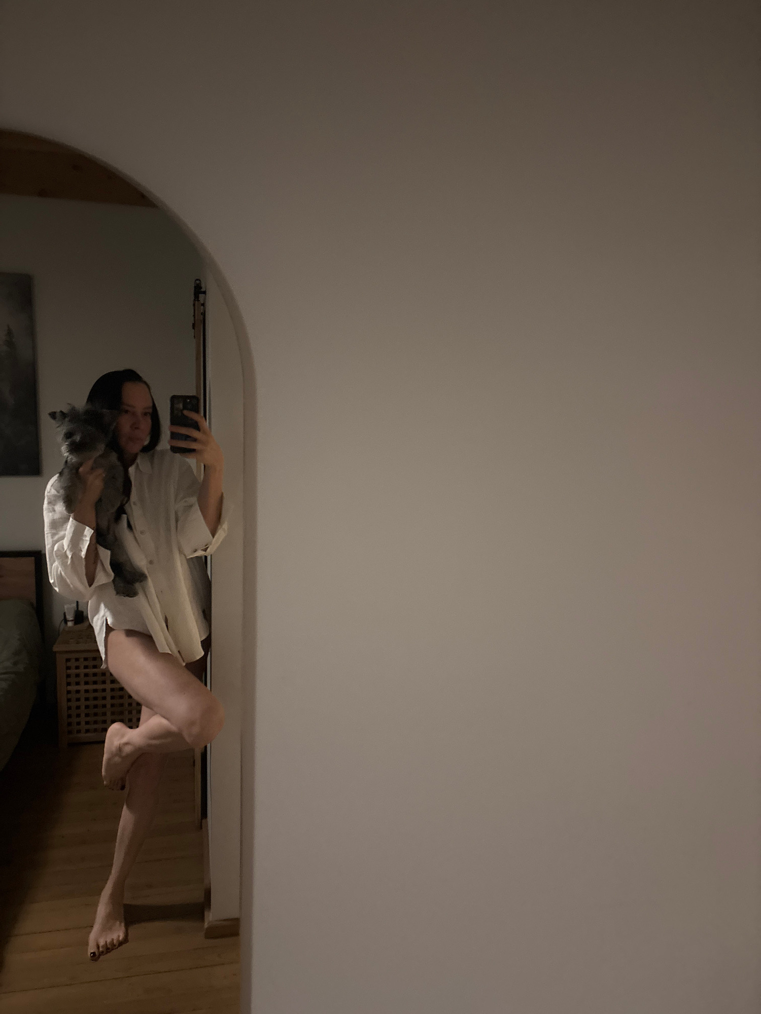 The image, correctly oriented, shows a woman taking a mirror selfie indoors while holding a gray pet. The woman has dark hair and is wearing a loose, light-colored long-sleeved shirt, with her lower l…read more