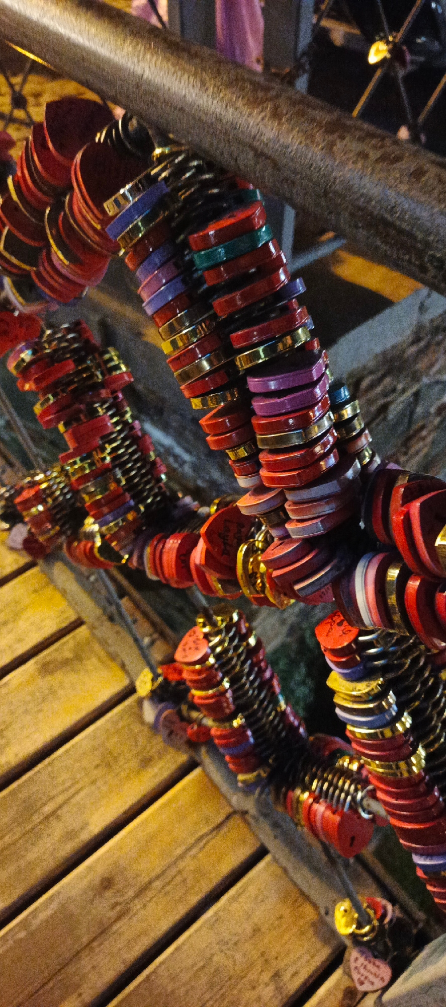 The image shows a close-up of a bridge railing in Tbilisi, Georgia, heavily adorned with love locks. The locks are predominantly heart-shaped, with various colors including red, purple, green, and whi…read more