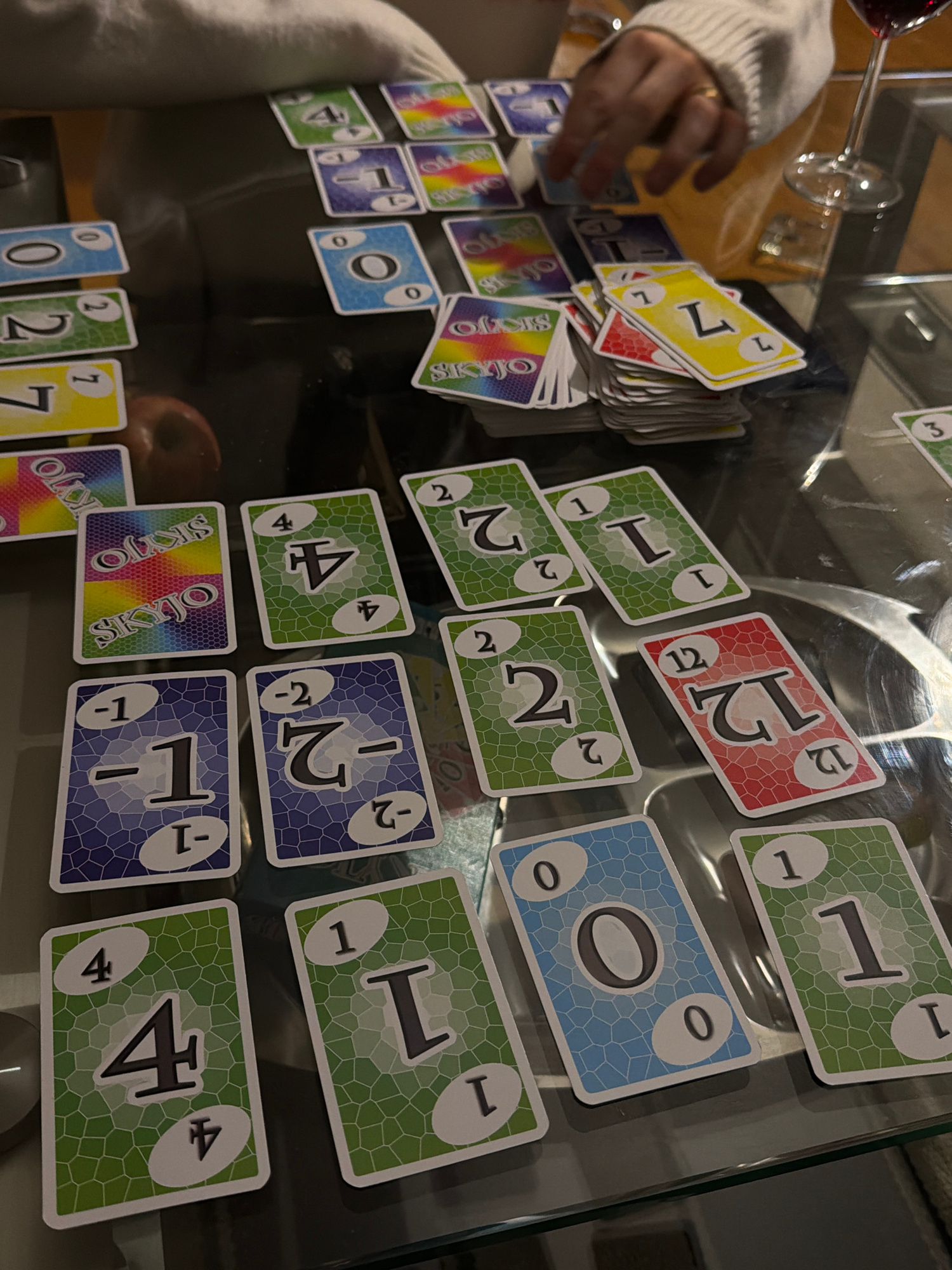 The image depicts a person, presumably playing the card game Skyjo, seated at a glass table. The table is scattered with Skyjo cards, face up. The cards display a variety of numbers in different color…read more