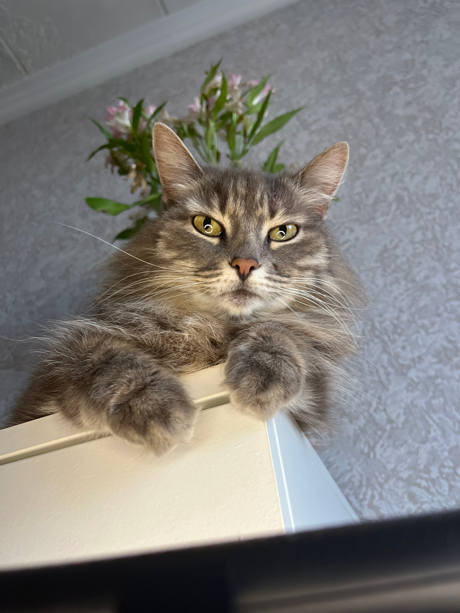 A gray tabby cat is clinging to the edge of a white cabinet or shelf. The cat is viewed from a low angle, looking down at the viewer. The cat has green eyes and a pink nose. There are flowers with pin…read more