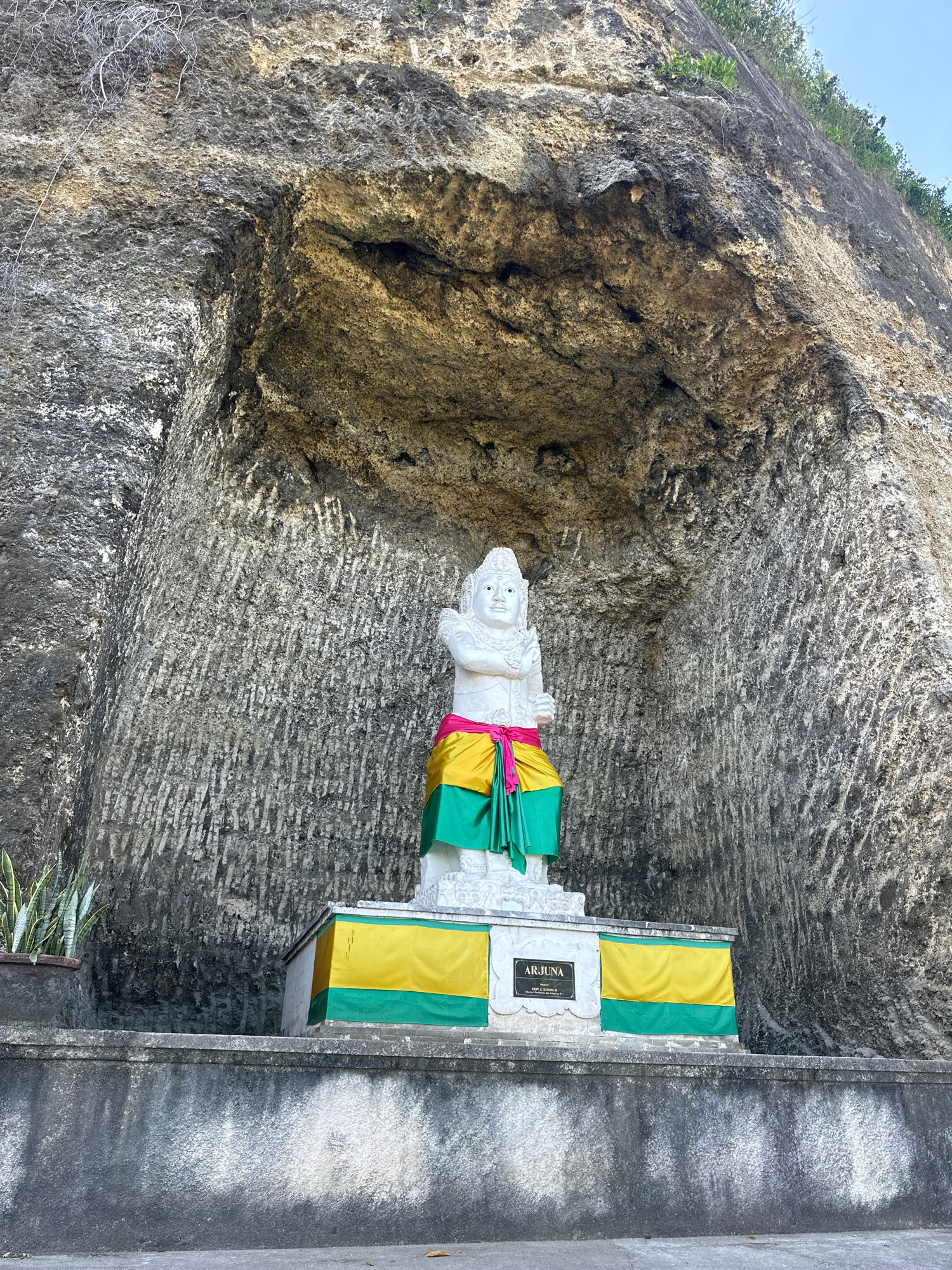 The image depicts a white statue of Arjuna, a figure from Hindu mythology, situated in a niche carved into a rocky cliff face. The statue is adorned with a sash of green, yellow, and pink fabric. A si…read more