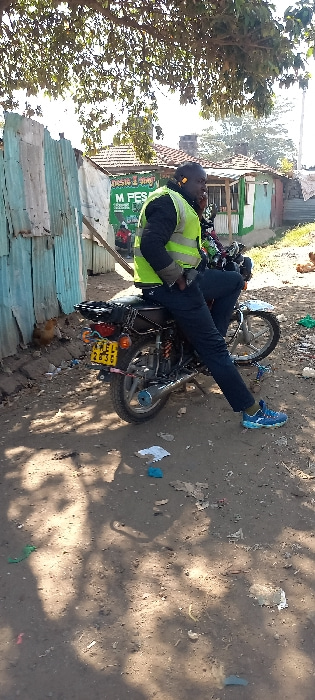 This image depicts a daytime outdoor scene in what appears to be an informal settlement or residential area of Nairobi, Kenya. In the midground, a dark-skinned male is seated on a black motorcycle, fa…read more