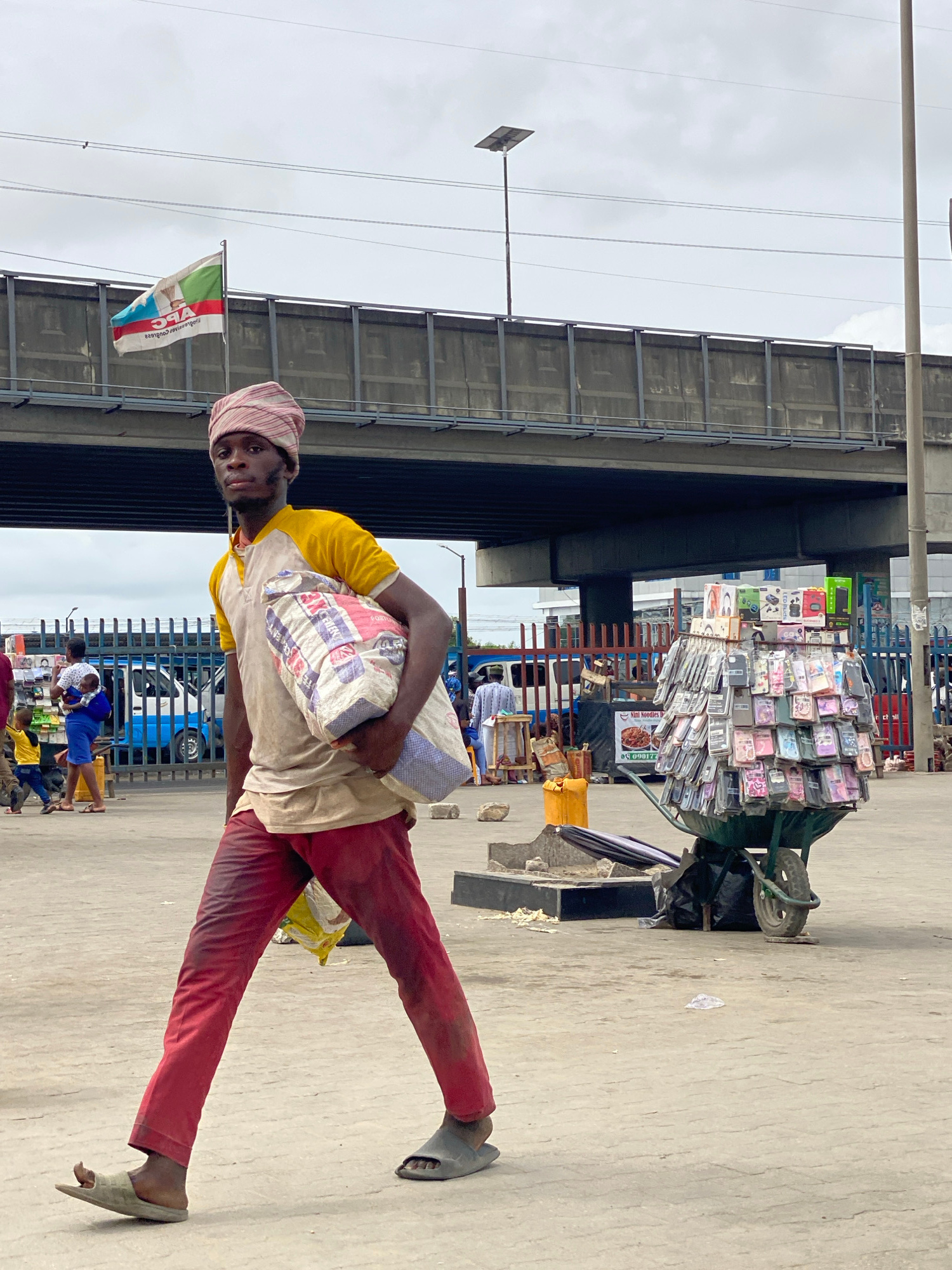 A street vendor stands in Lekki, Nigeria, carrying a heavy sack on his shoulder. He wears a yellow shirt, red pants, a headwrap, and sandals. Behind him, a vendor's cart displays various phone cases a…read more