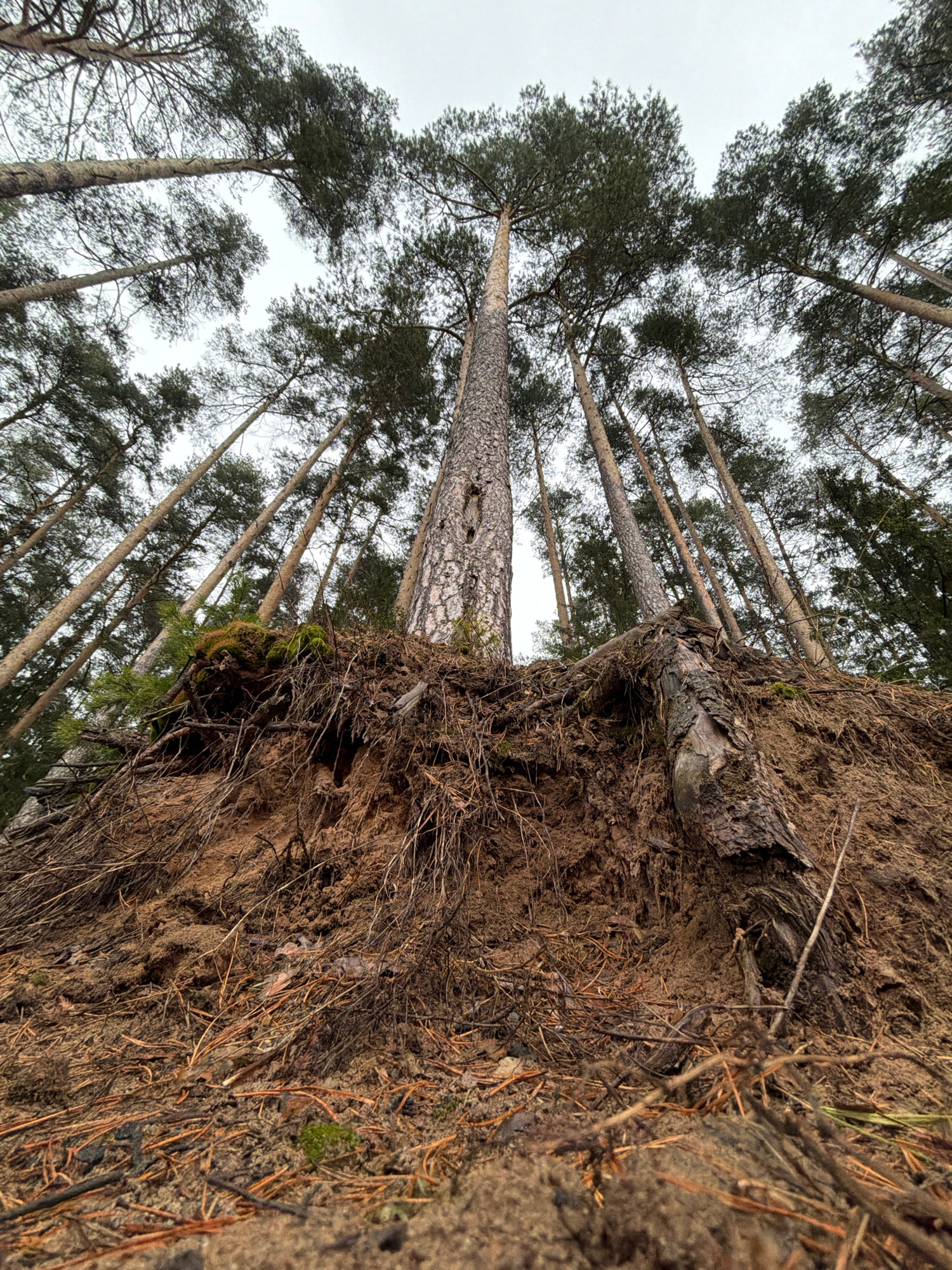 The image depicts a forest scene, likely taken at a low angle, looking upwards. The foreground features a dirt embankment, with exposed roots and fallen pine needles. Several tall pine trees dominateβ¦read more