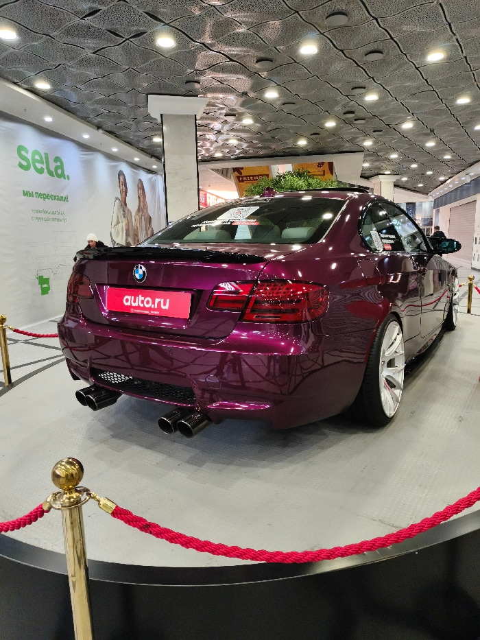 A purple BMW with a spoiler and four exhaust pipes is on display, roped off by red velvet ropes and gold stanchions. The car has an "auto.ru" license plate and a sunroof. The background includes a sho…read more