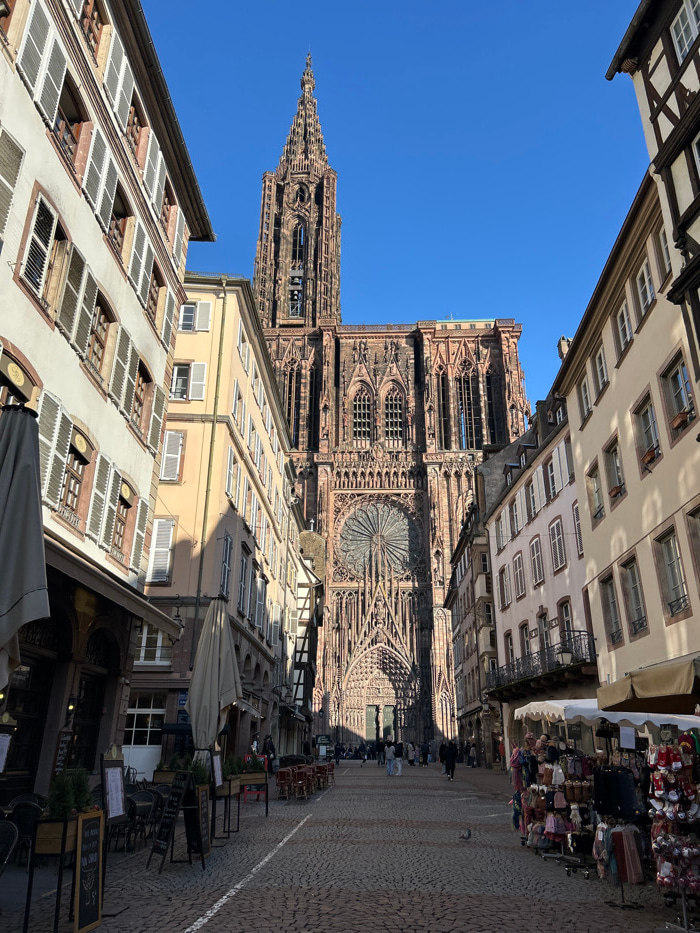 The image displays a perspective view down a pedestrianized cobblestone street directly facing the west facade of the Strasbourg Cathedral (Cathédrale Notre-Dame de Strasbourg) in the city center of S…read more