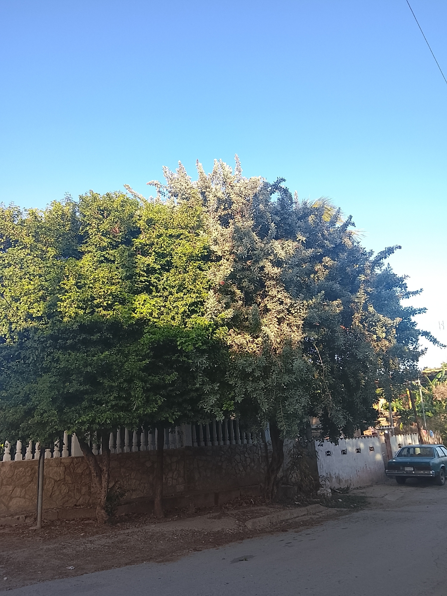 A street scene in Altagracia, Venezuela, depicts a sunny day with a clear blue sky. The foreground shows a paved road with dirt and debris on the shoulder. Two trees dominate the scene: one with denseβ¦read more