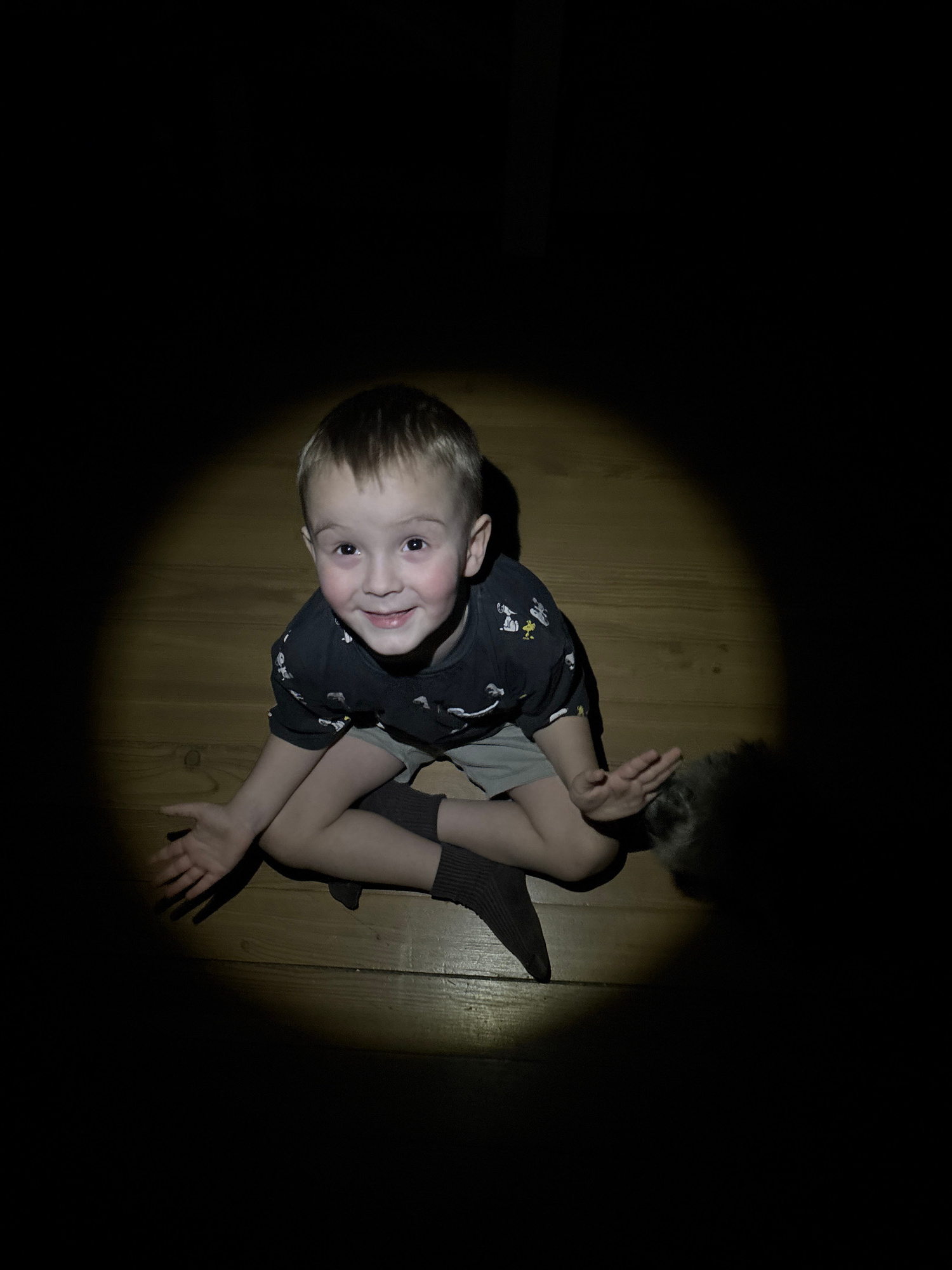 A young child is the primary subject of this image, which appears to be taken indoors, possibly in a domestic setting. The child, a boy with light hair and fair skin, is sitting on what seems to be a…read more