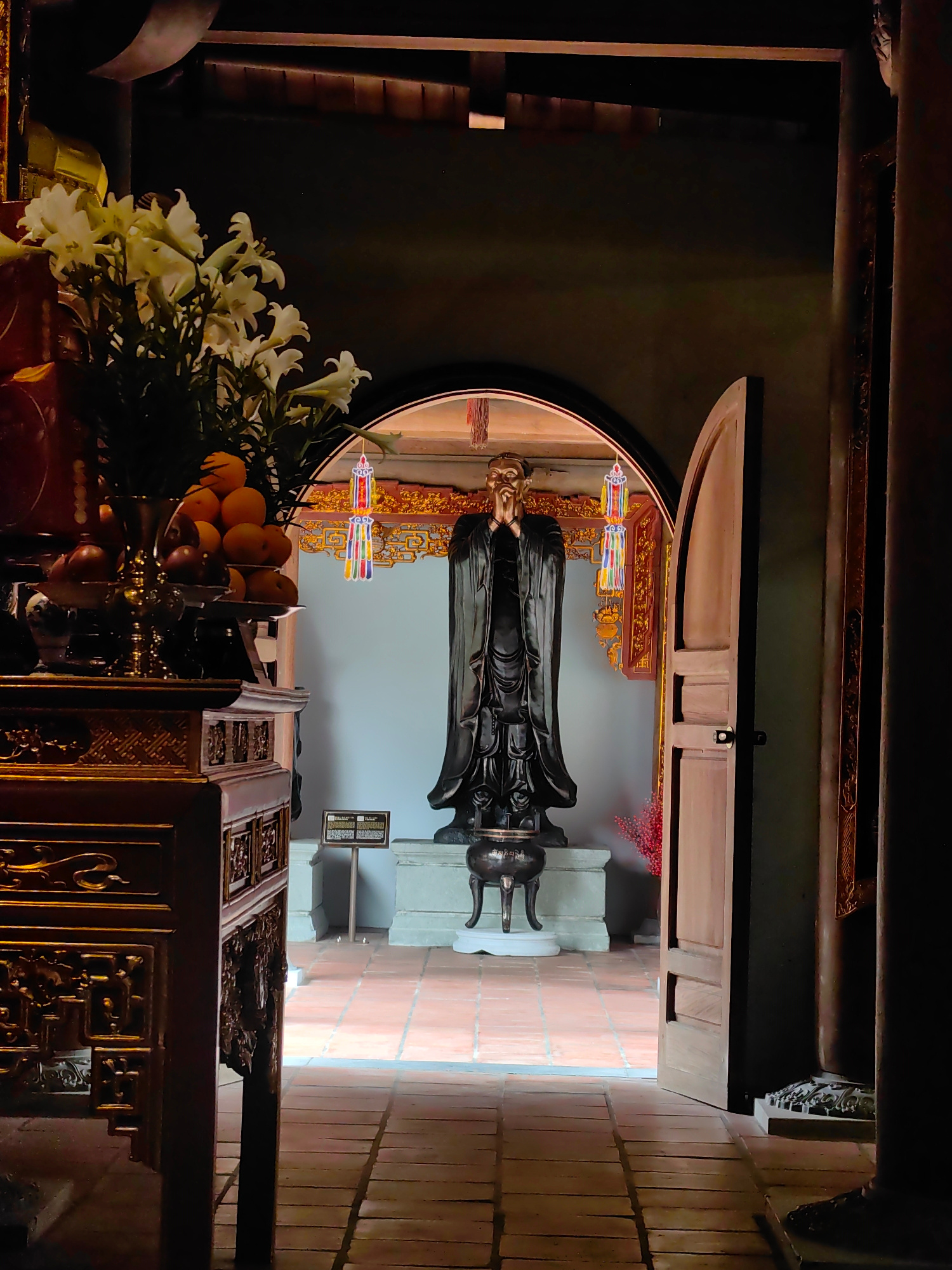 The image captures an interior scene in Hong Gai Ward, Vietnam. A statue of a man stands in a room framed by an arched doorway with an open door, leading from a darker room into a brighter space. Theβ¦read more
