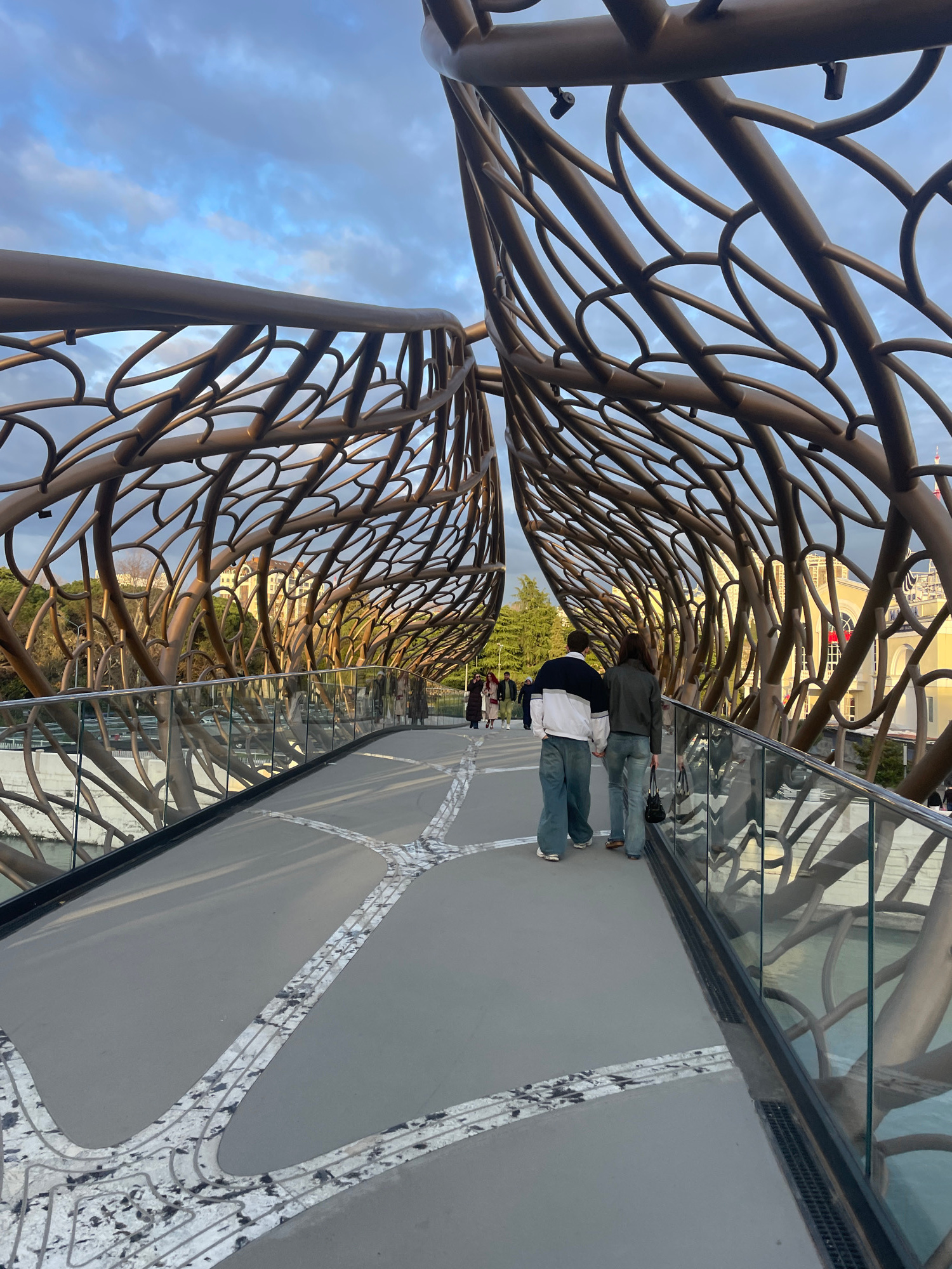 The photograph captures a scene on the "Fig Tree Bridge" in Sochi, Russia. The bridge is notable for its metal structure resembling a stylized tree, forming an archway over the walkway. Two individual…read more