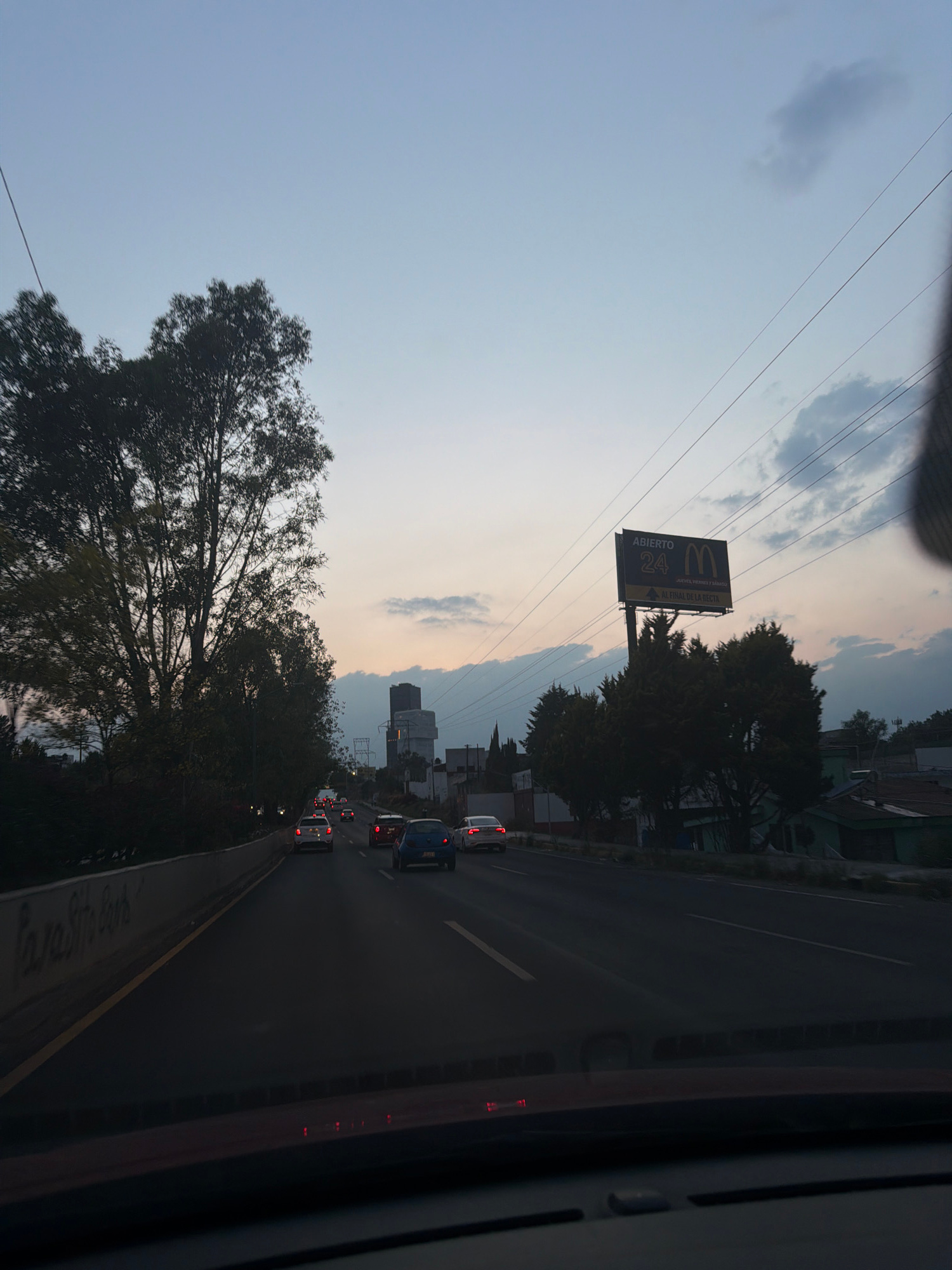 The image, taken from within a moving vehicle, shows a highway in Puebla, Mexico. The camera faces forward, capturing the road ahead with several cars driving in the same direction. A large billboard…read more