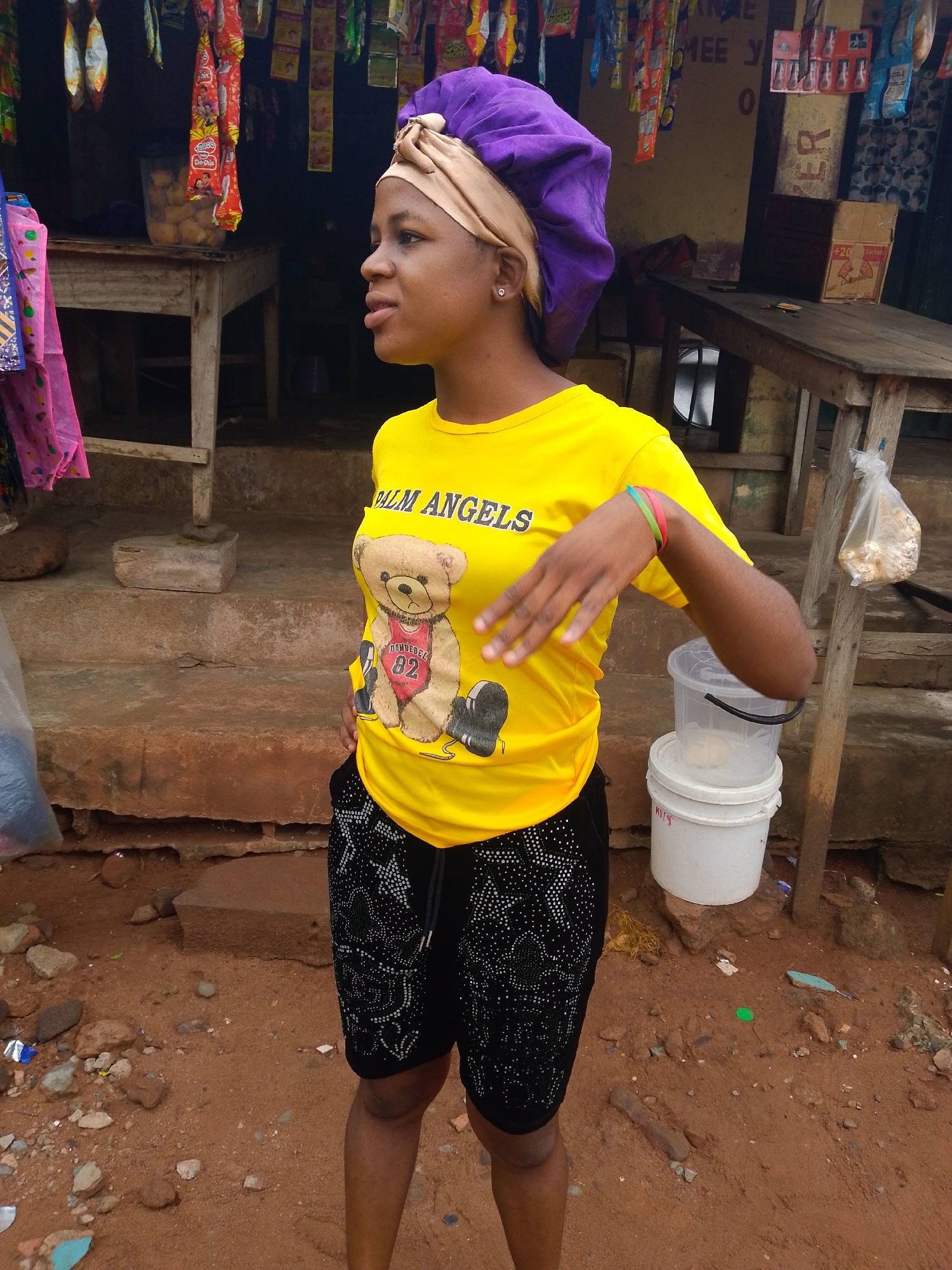 A young woman stands outside a roadside shop in Alor, Nigeria. She wears a yellow t-shirt with a teddy bear graphic, black patterned shorts, and a purple head covering with a beige underlayer. Her lefβ¦read more