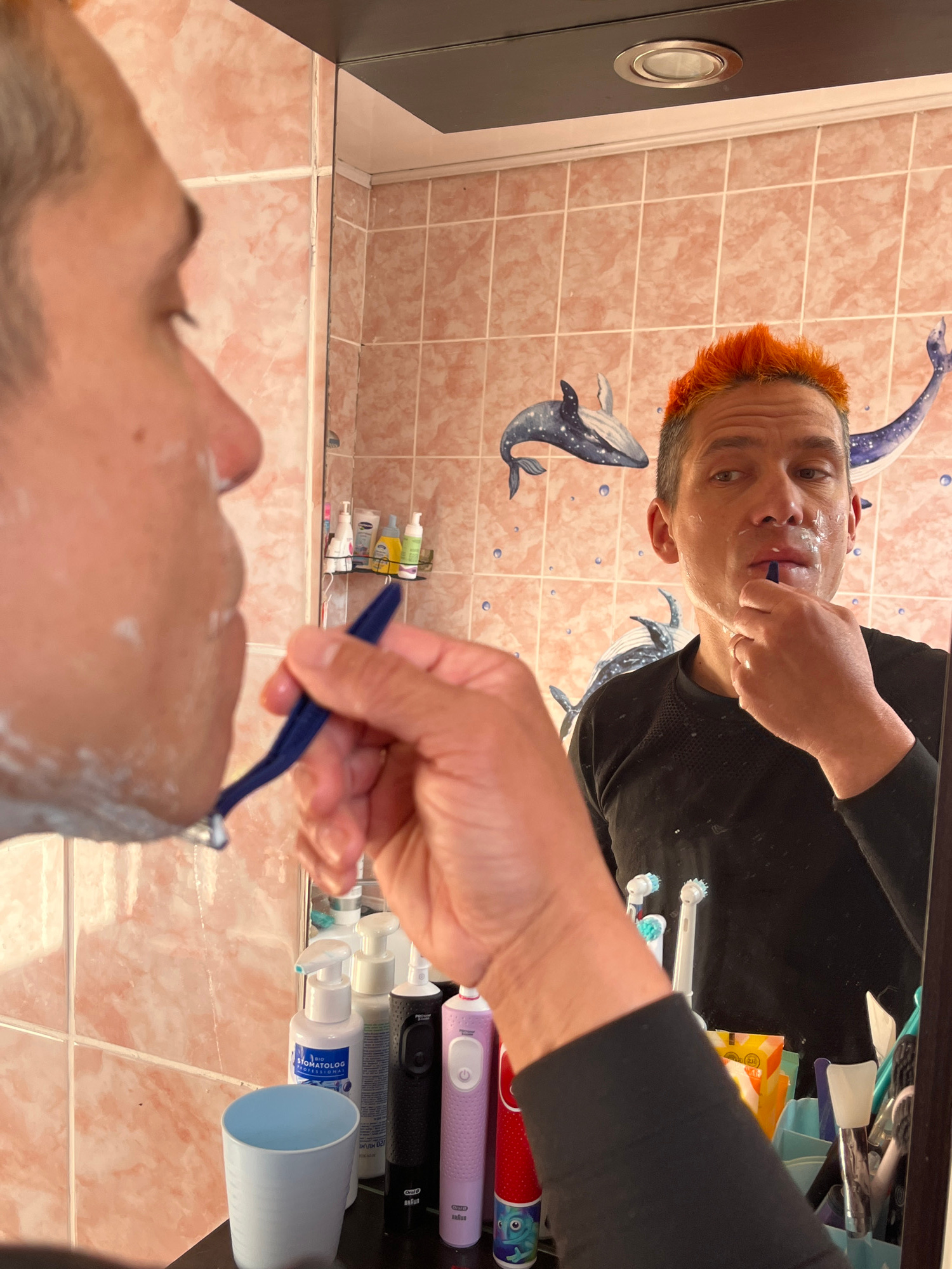 The image shows a person with orange hair brushing their teeth in a bathroom with pink tile and whale decals. A second person is shaving in the reflection of the mirror. The location is a bathroom in…read more