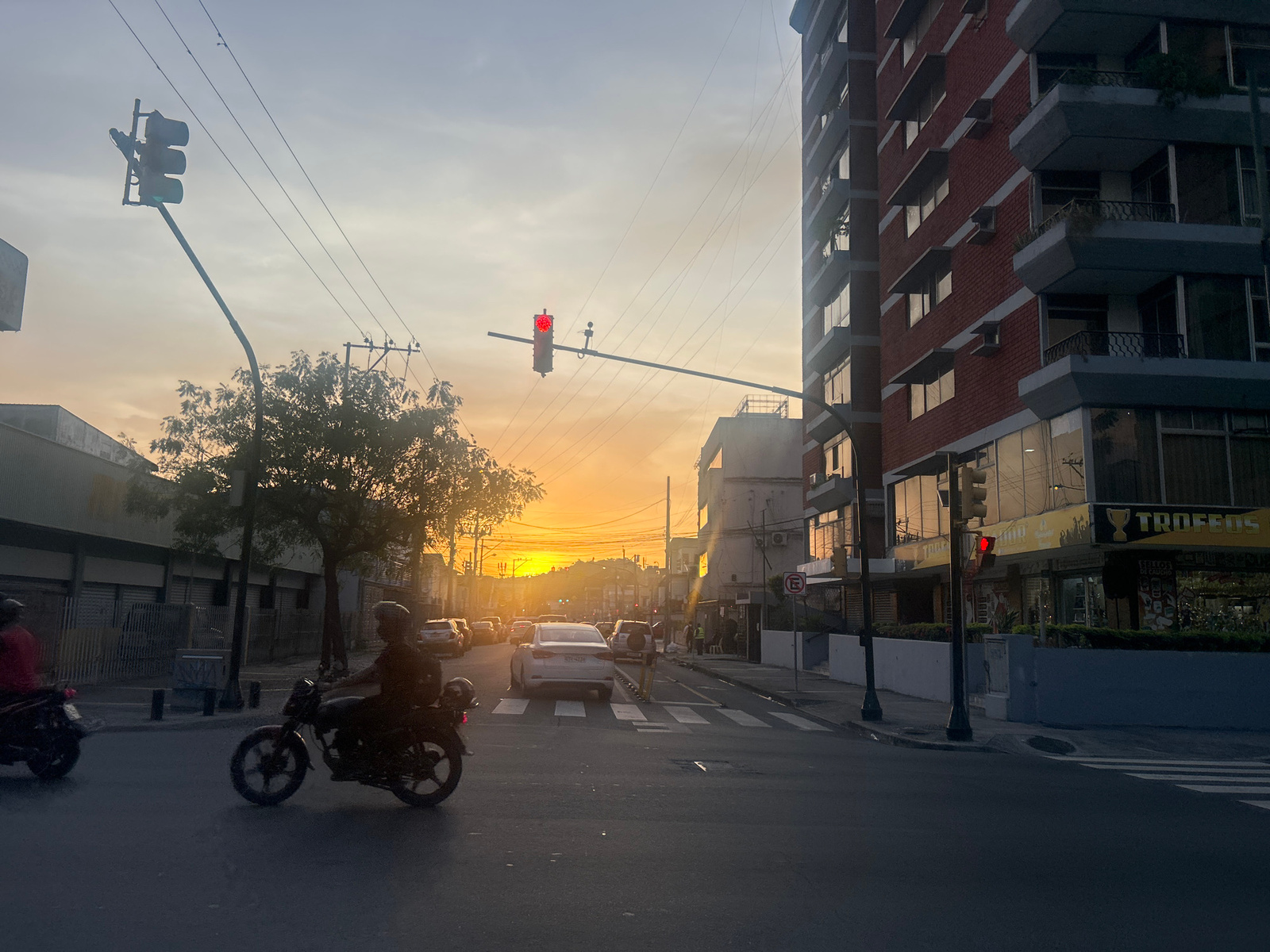 Here is a detailed description of the image: The image captures an urban scene at sunset in Guayaquil, Ecuador. The view is from a street corner, looking eastward towards a bright orange horizon. Sev…read more
