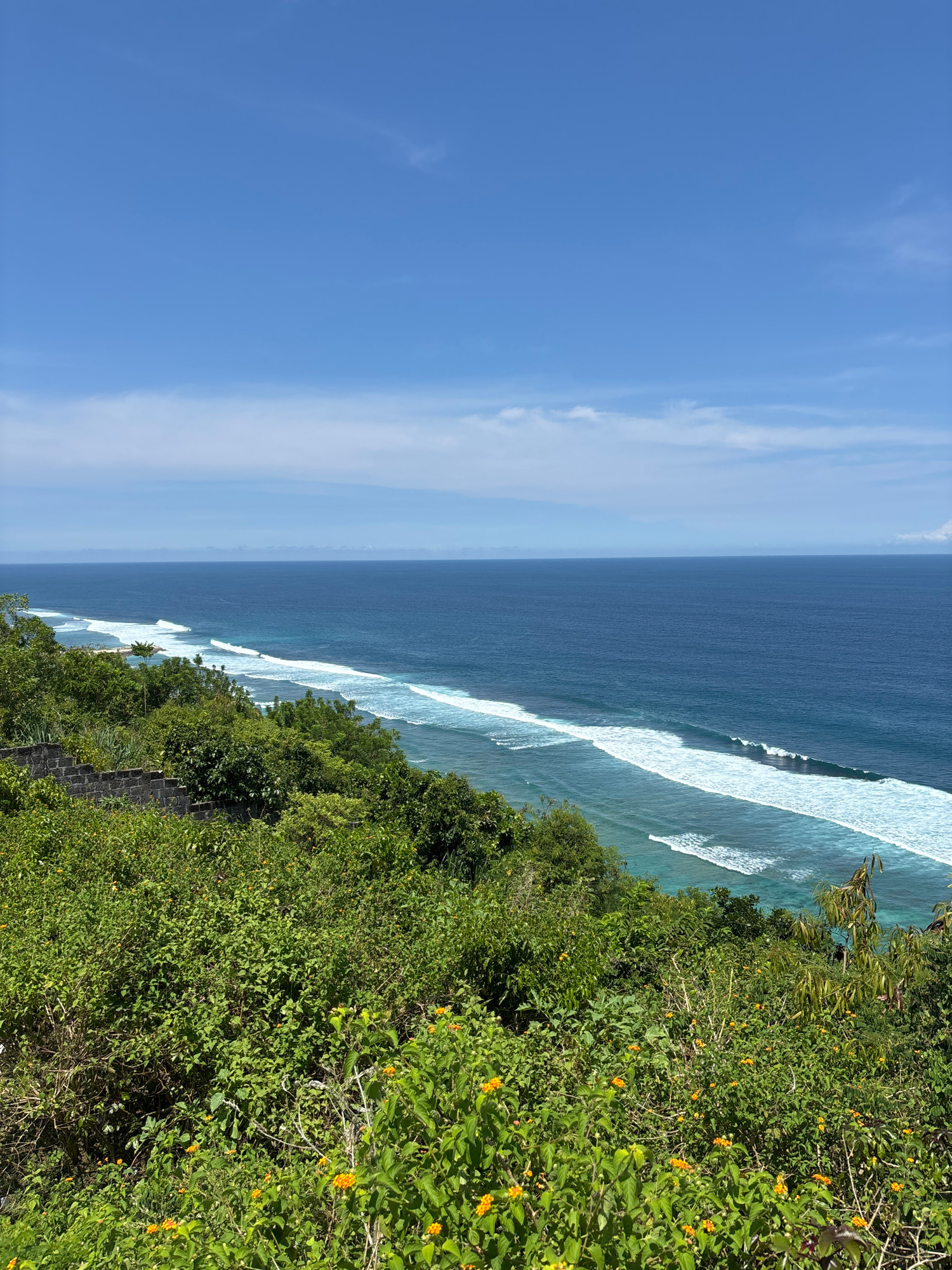 The image shows a view of the ocean and sky from the clifftop in Ungasan, Indonesia. The blue sky takes up the left side of the image with faint clouds. The ocean occupies the center of the frame, witβ¦read more