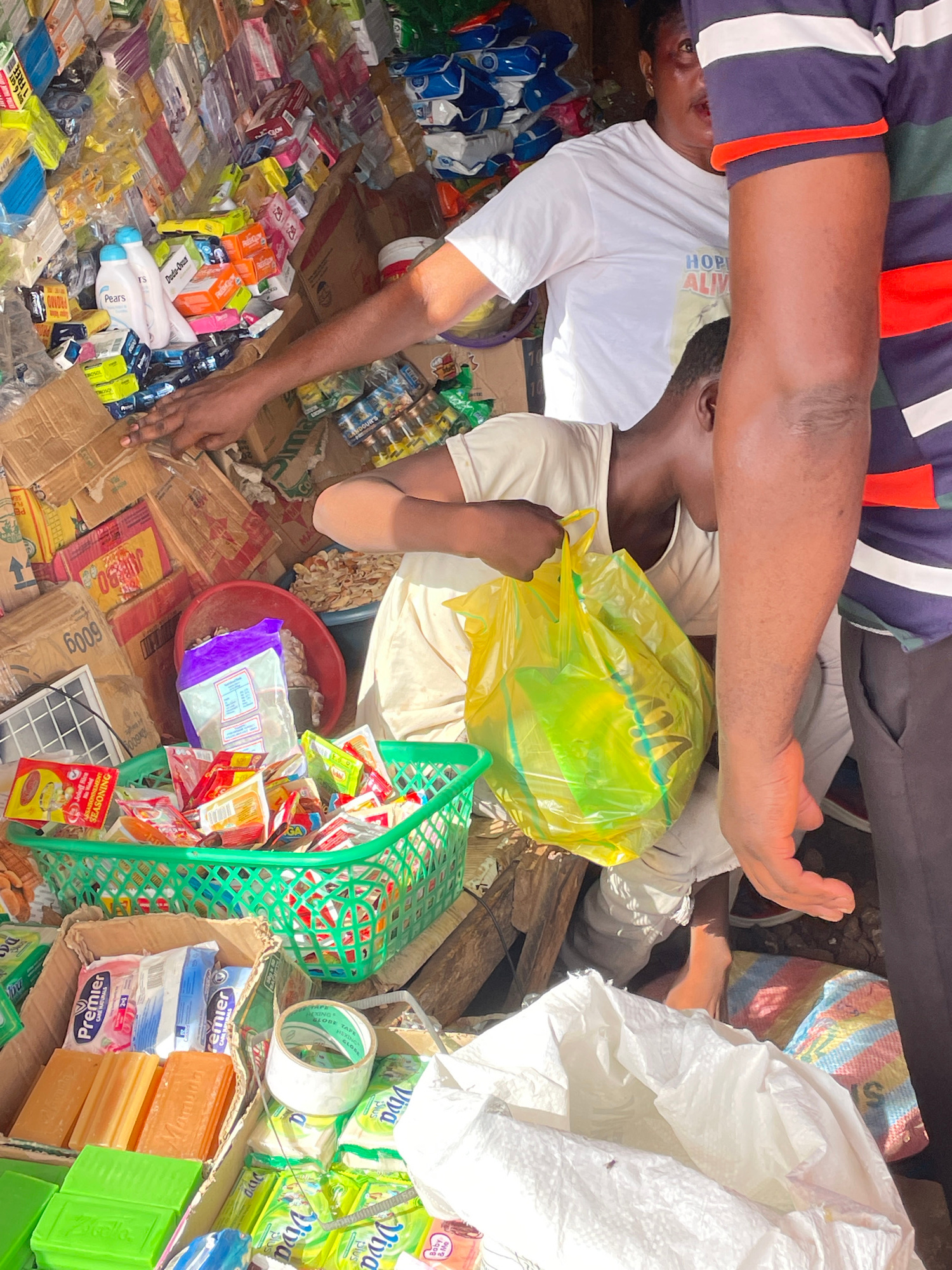 The image shows a market scene in Akwanga, Nigeria. Two dark-skinned individuals are present, one wearing a white t-shirt with the inscription "HOPE ALIV" and the other wearing a striped navy blue, wh…read more