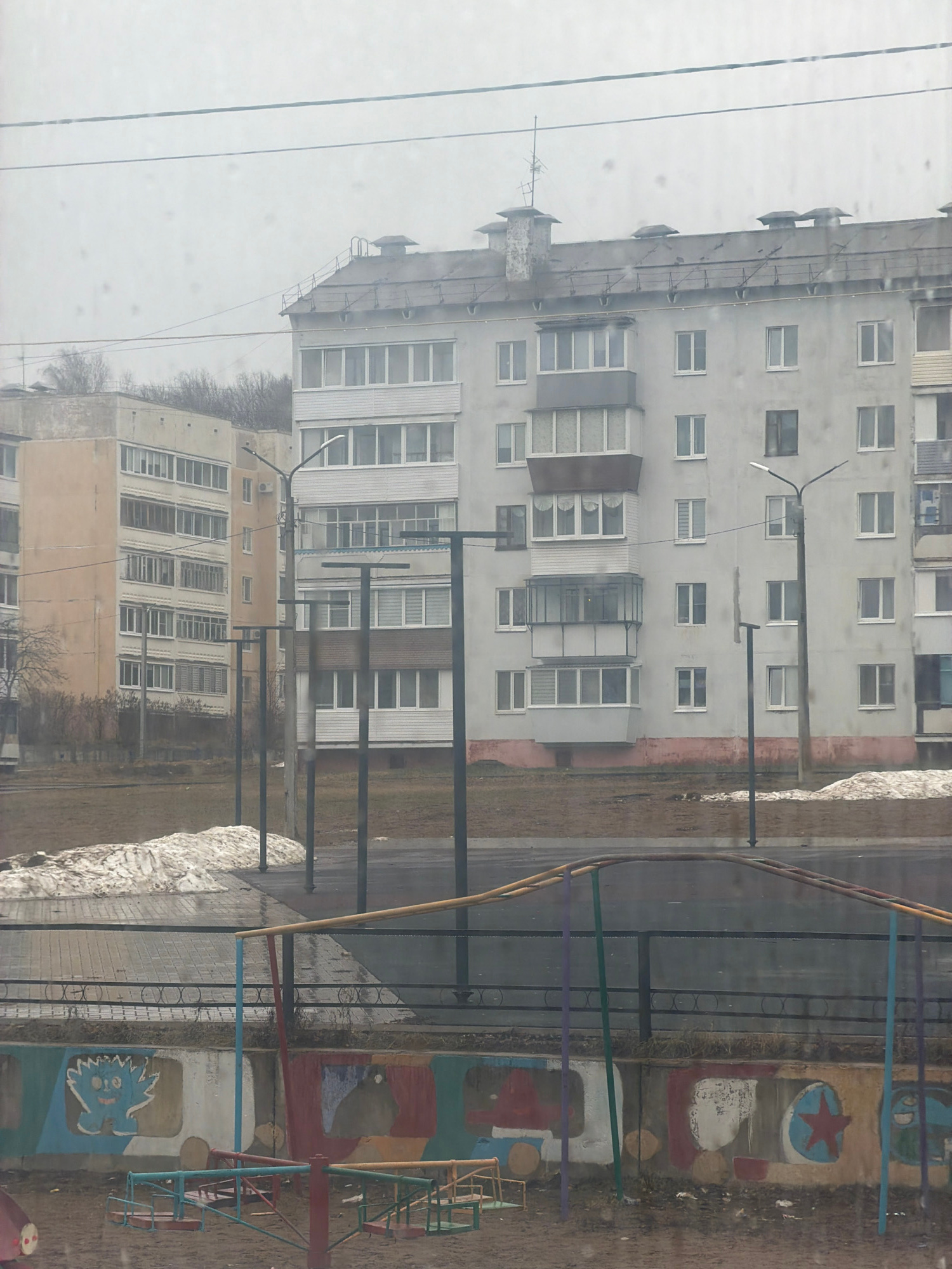 A view of buildings in Noviy Urengoy, Russia, from an elevated vantage point, likely a window. The buildings are multi-story residential structures, predominantly gray in color. Streetlights are prese…read more