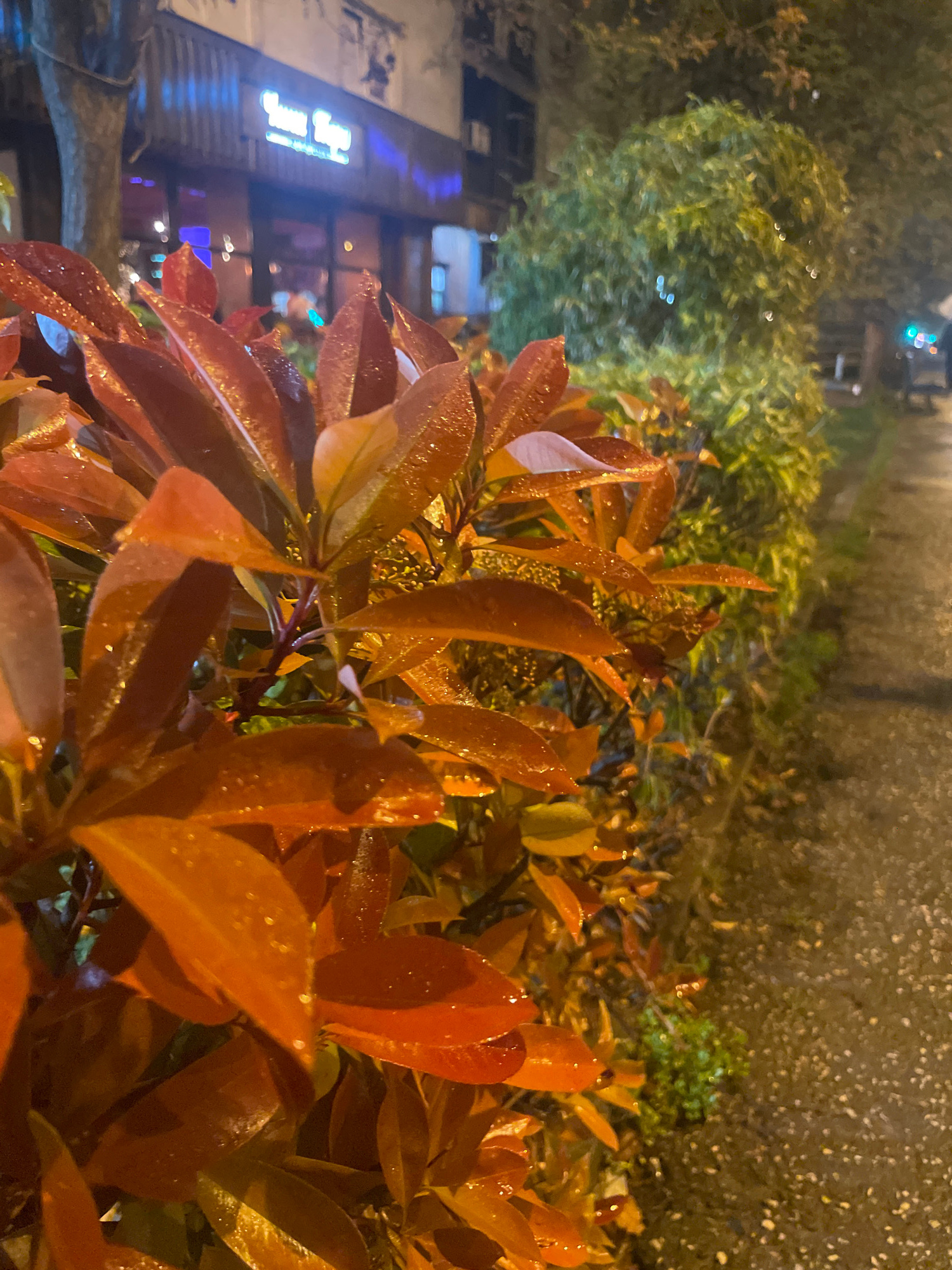 The image depicts a close-up of wet, reddish-brown leaves. In the background, out of focus, are green plants, a building with illuminated signs, and a light-colored wall or street. The location is Nov…read more