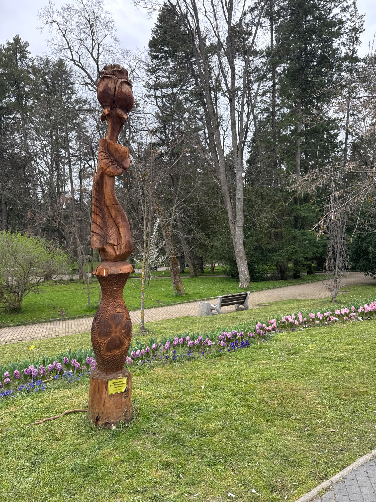 A wooden statue stands in a park in Bankya, Bulgaria. The statue is carved from a tree trunk and depicts an abstract floral design. It is positioned on a grassy area between a paved walkway and a line…read more