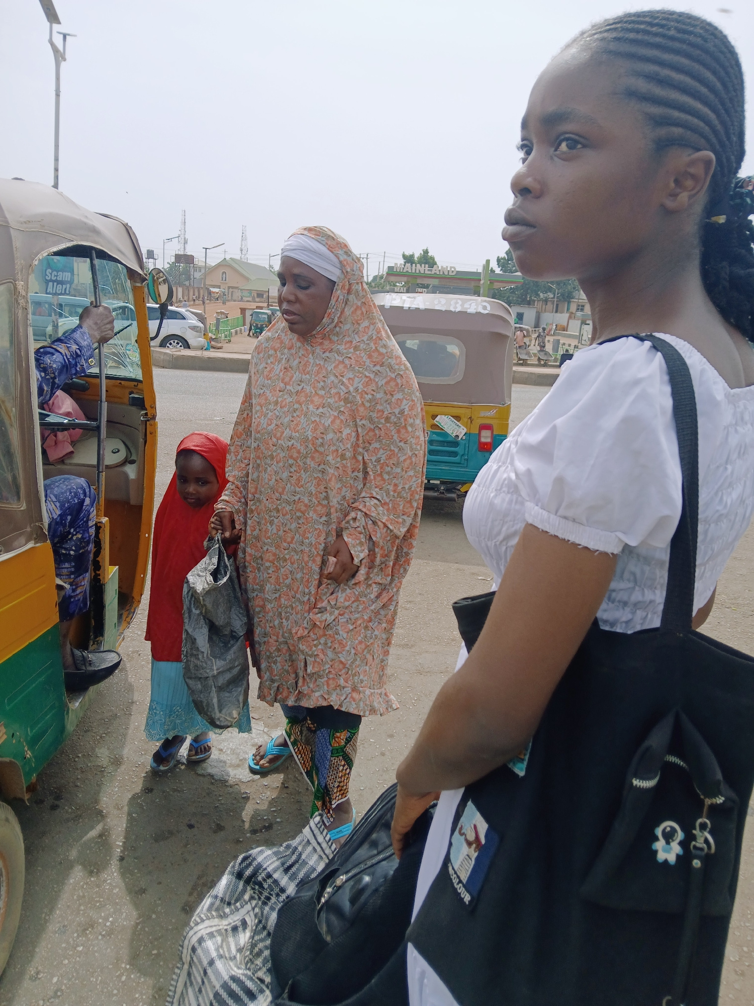 The image captures a street scene in Jos, Nigeria. A young woman in a white blouse and black shoulder bag is in the foreground. Behind her, a woman in a floral hijab and a child in a red hijab stand n…read more