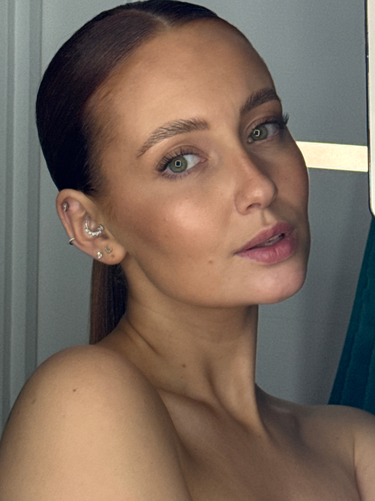 The media file displays a close-up portrait of a person, likely a young woman, with her head slightly tilted and her gaze directly engaging the viewer. She has fair skin, dark hair pulled back from he…read more