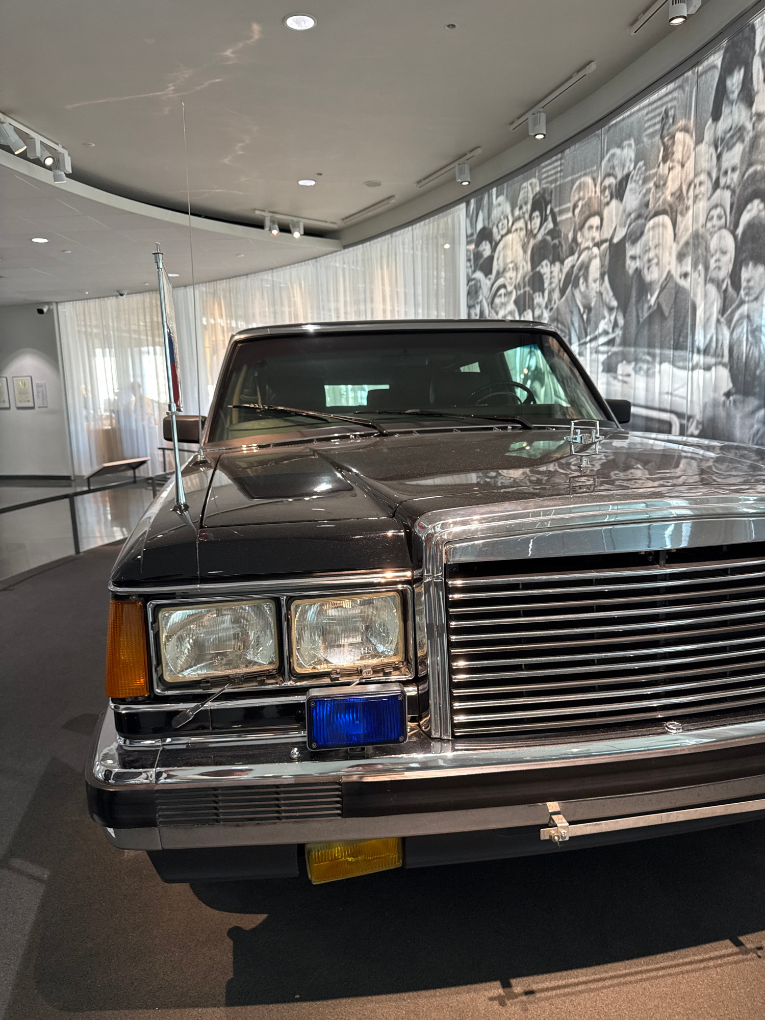The image captures the front of a black car with chrome accents and a distinctive vertical grill, a square headlight configuration (two headlights on each side), and a small antenna extending horizont…read more