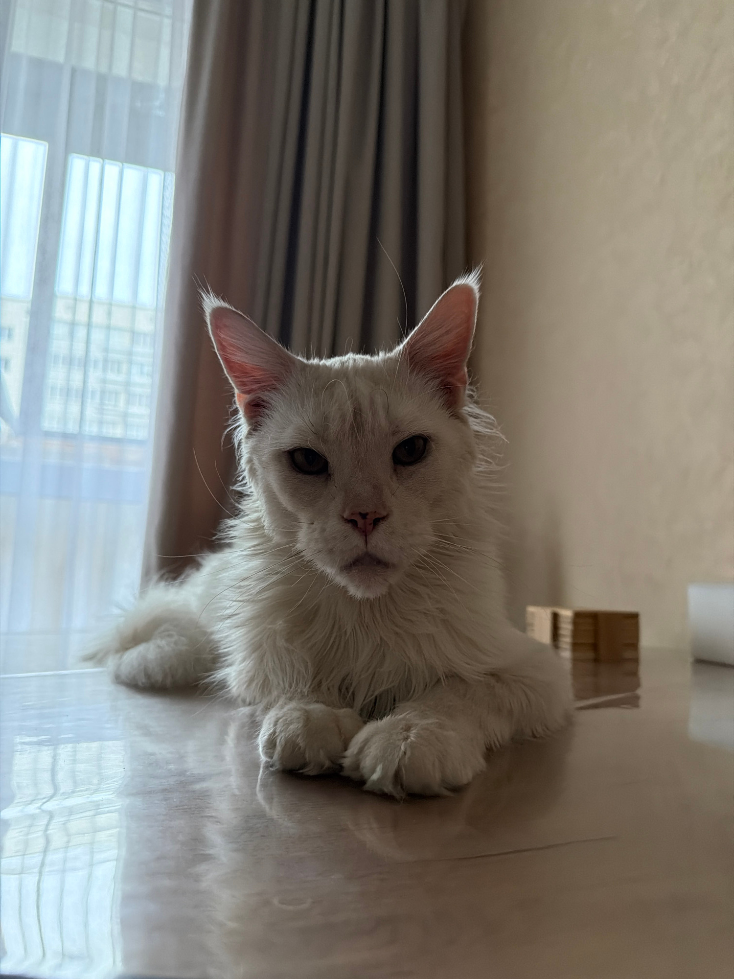 A white cat is lying on a surface indoors. The cat is facing the camera with its head tilted slightly. It has long fur, pink ears, and dark eyes. The background includes a window with a sheer curtain,…read more