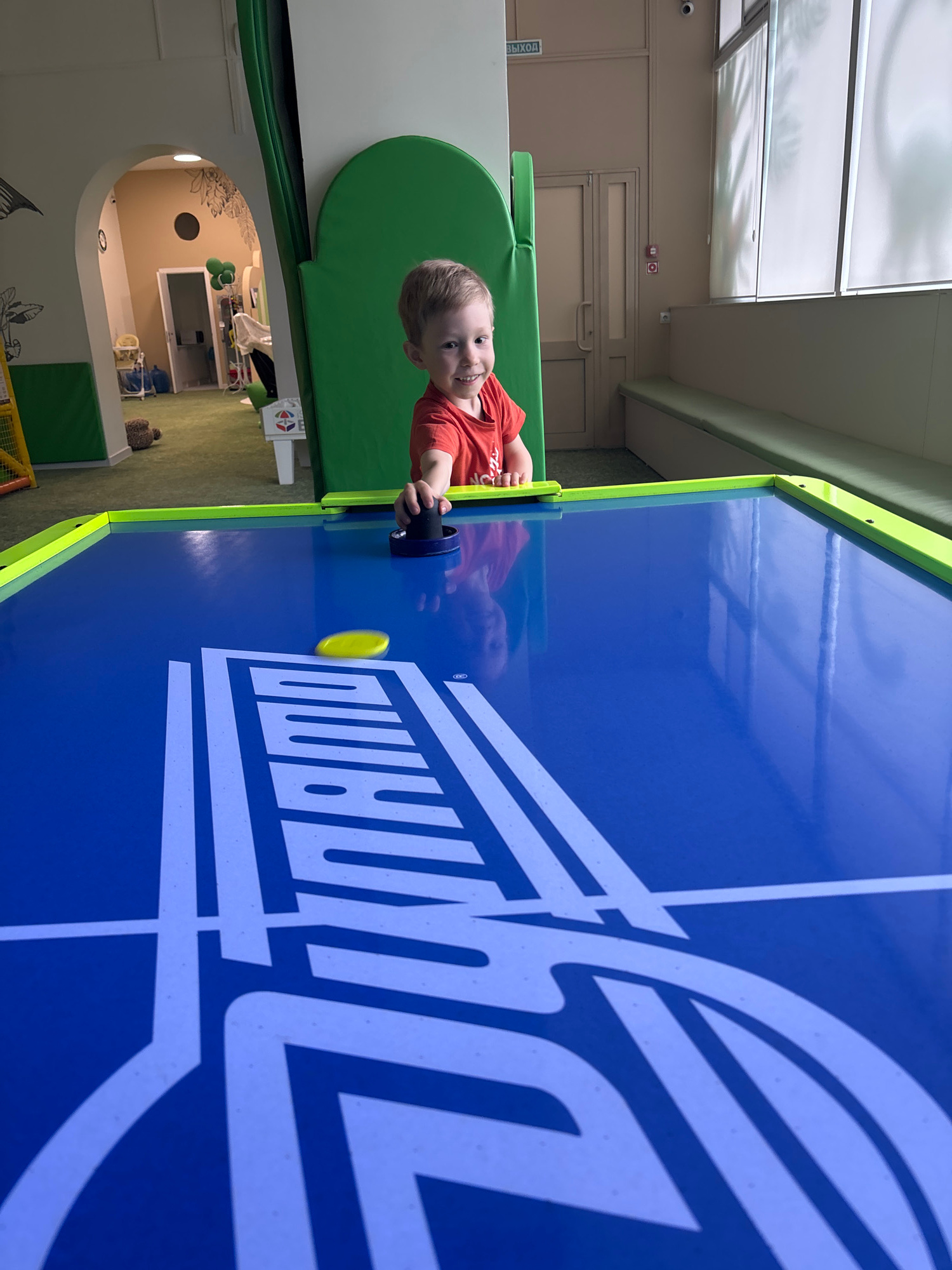 A young boy plays air hockey in an indoor play area. He wears a red shirt and holds a black air hockey paddle in his right hand. A yellow air hockey puck is in play on the blue air hockey table. The l…read more