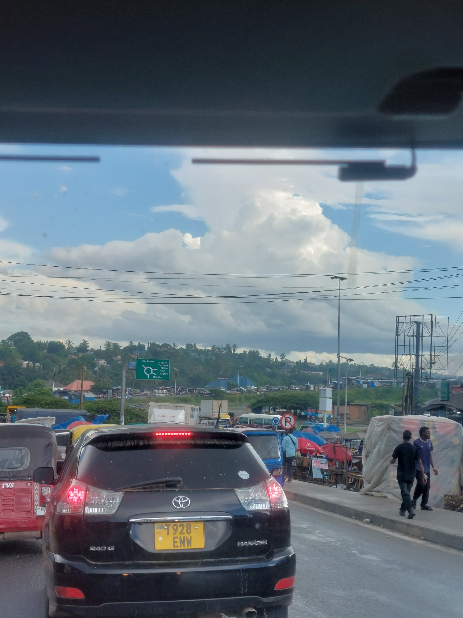 The image depicts a traffic jam in Dar es-Salaam, Tanzania. The camera is positioned inside a vehicle, looking out at other vehicles and roadside activity. A black Toyota Harrier with license plate T9…read more