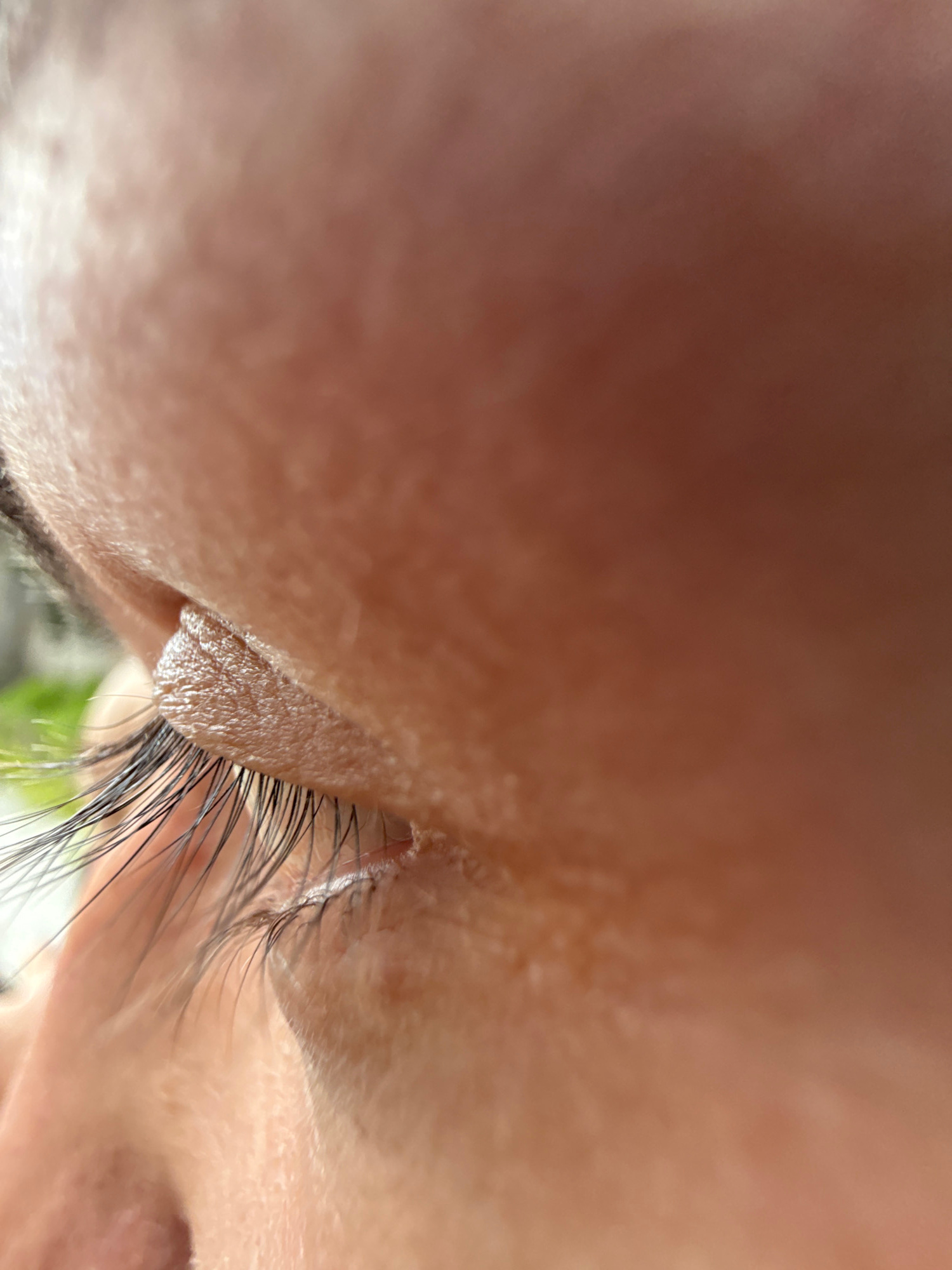 Close-up image of a closed human eye with eyelashes. The skin surrounding the eye is visible, showing texture and pores. The image lacks specific details that would allow identification of a location…read more