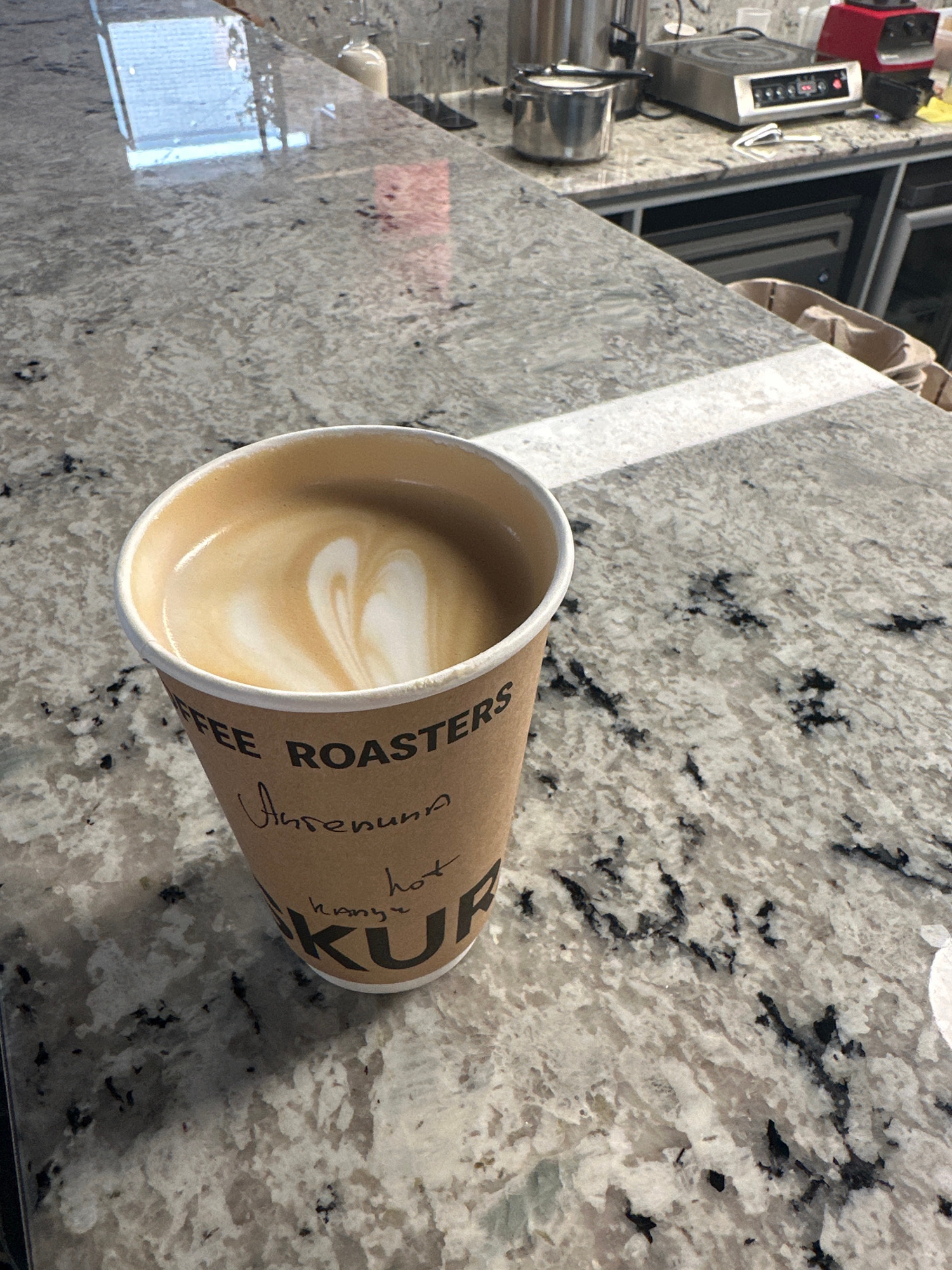 A cup of coffee sits on a gray countertop with black and white speckled pattern. The cup has the words "COFFEE ROASTERS" and "Amrenuna" handwritten on it. Also on the cup is "KUU", and "Kanzur hot". I…read more