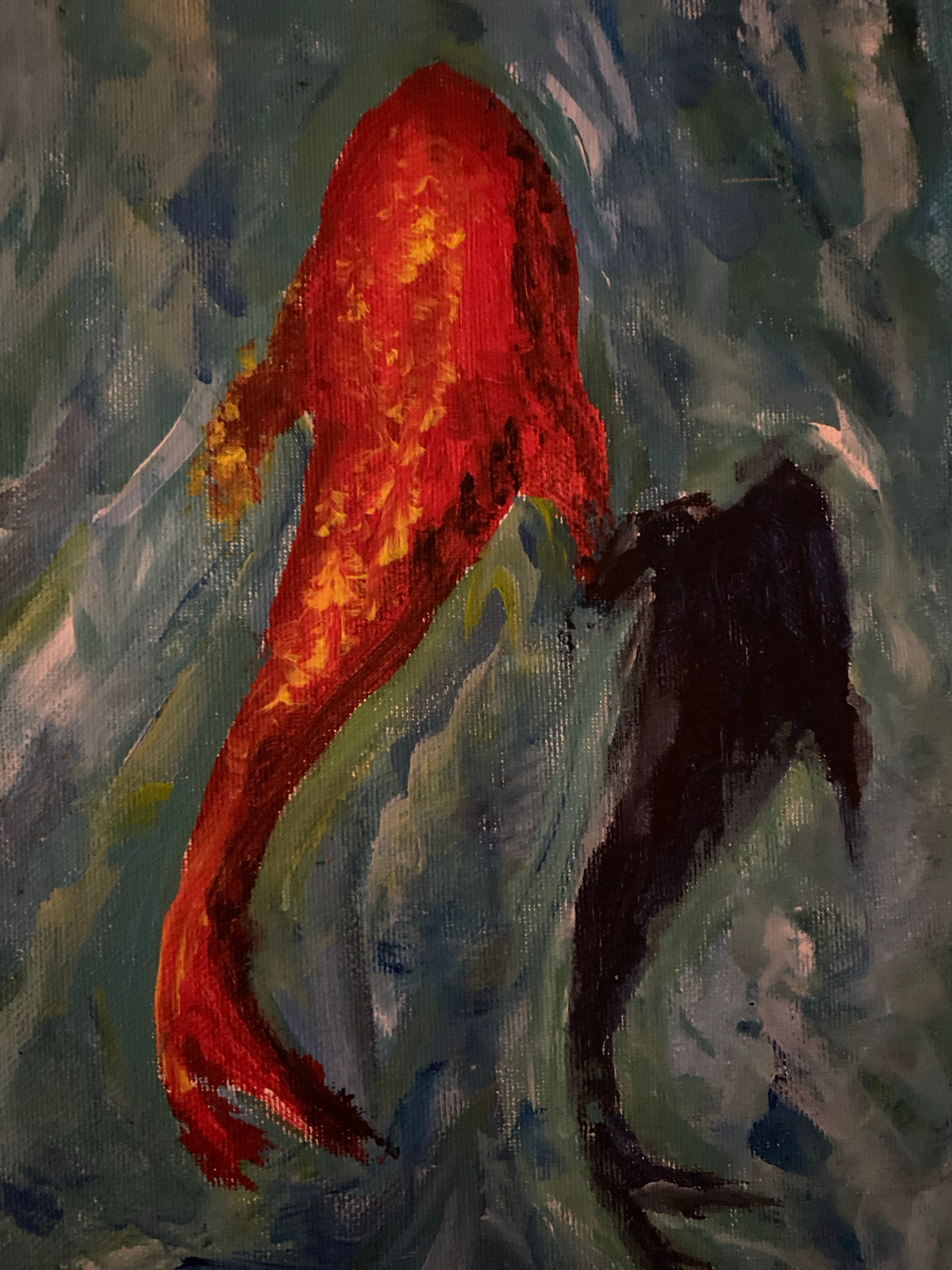 The image is a painting depicting two fish swimming in water. One fish is a vibrant orange-red color with hints of yellow. The other fish is a dark, almost black color. The water is rendered with stro…read more