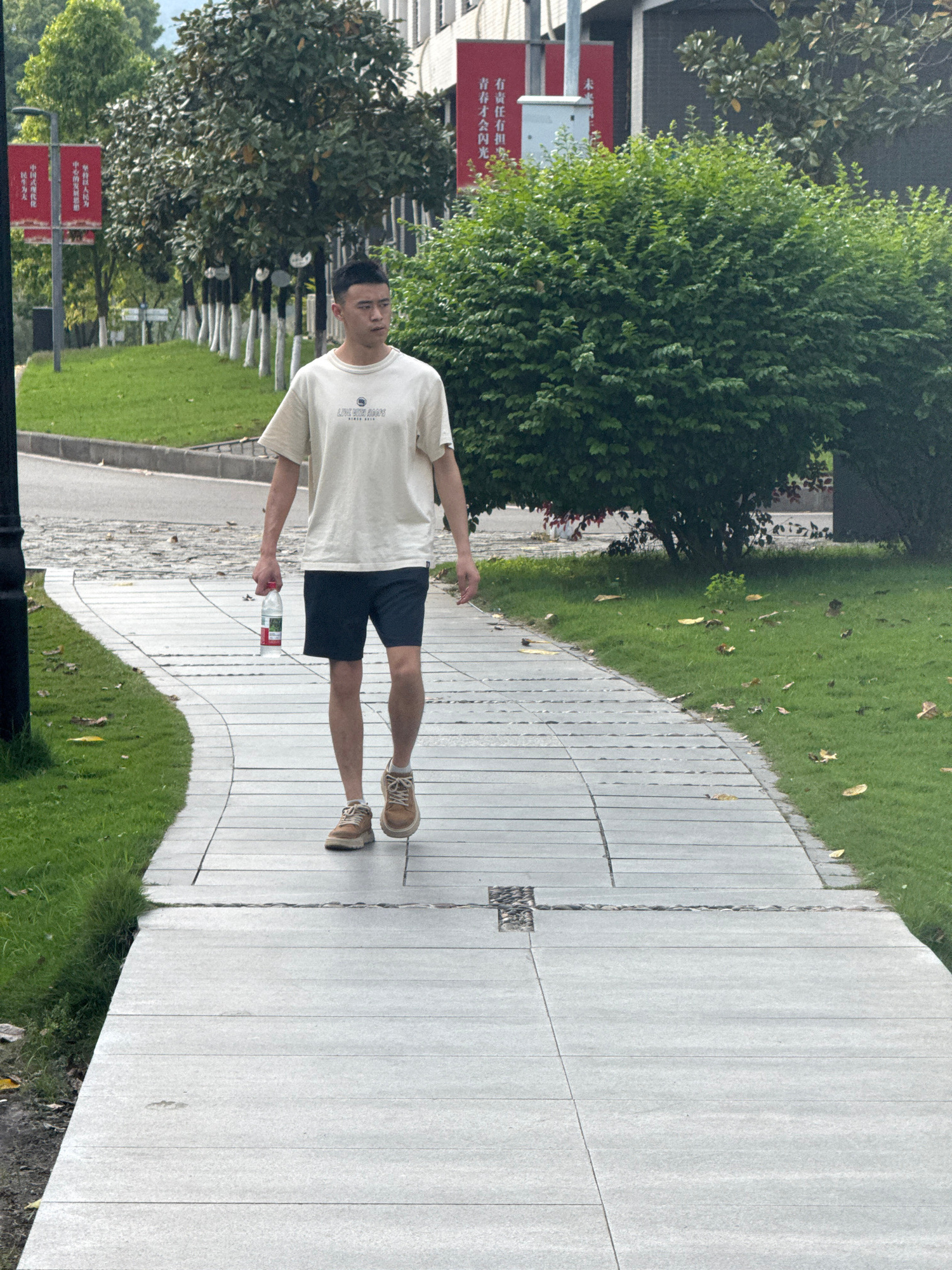 A young man is standing on a sidewalk in what appears to be a park or recreational area in Jiangjin, China. He is wearing a light-colored t-shirt, dark shorts, and tan sneakers. He is holding a bottle…read more