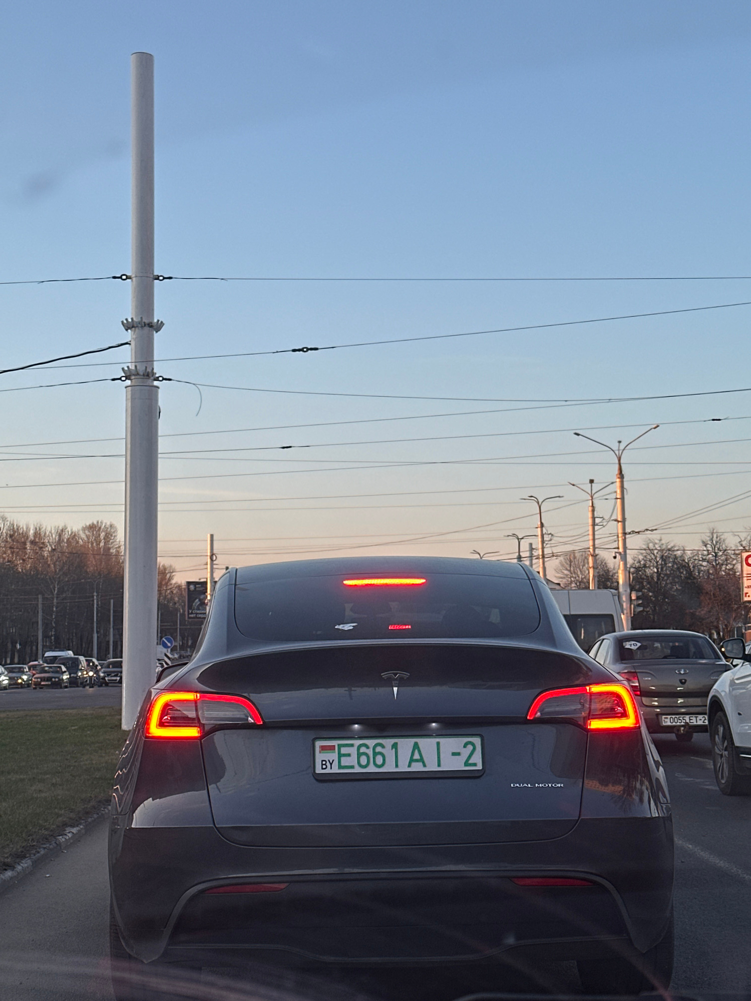 The image shows the rear of a dark grey Tesla Model Y with Belarusian license plate "E661 AI-2" in traffic. The license plate indicates the car is registered in the Vitsebsk region of Belarus. "DUAL MOTOR" badge is visible on the rear of the vehicle. The car is likely in a congested urban area as evidenced by other vehicles ahead and behind it. Power lines and utility poles are present in the background, along with trees and buildings in the distance. The sky suggests either early morning or late afternoon. | Open Wire
