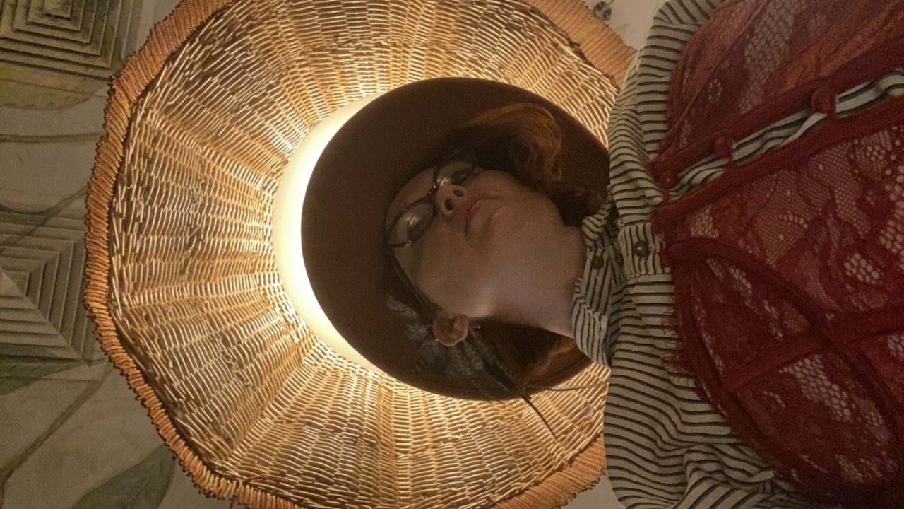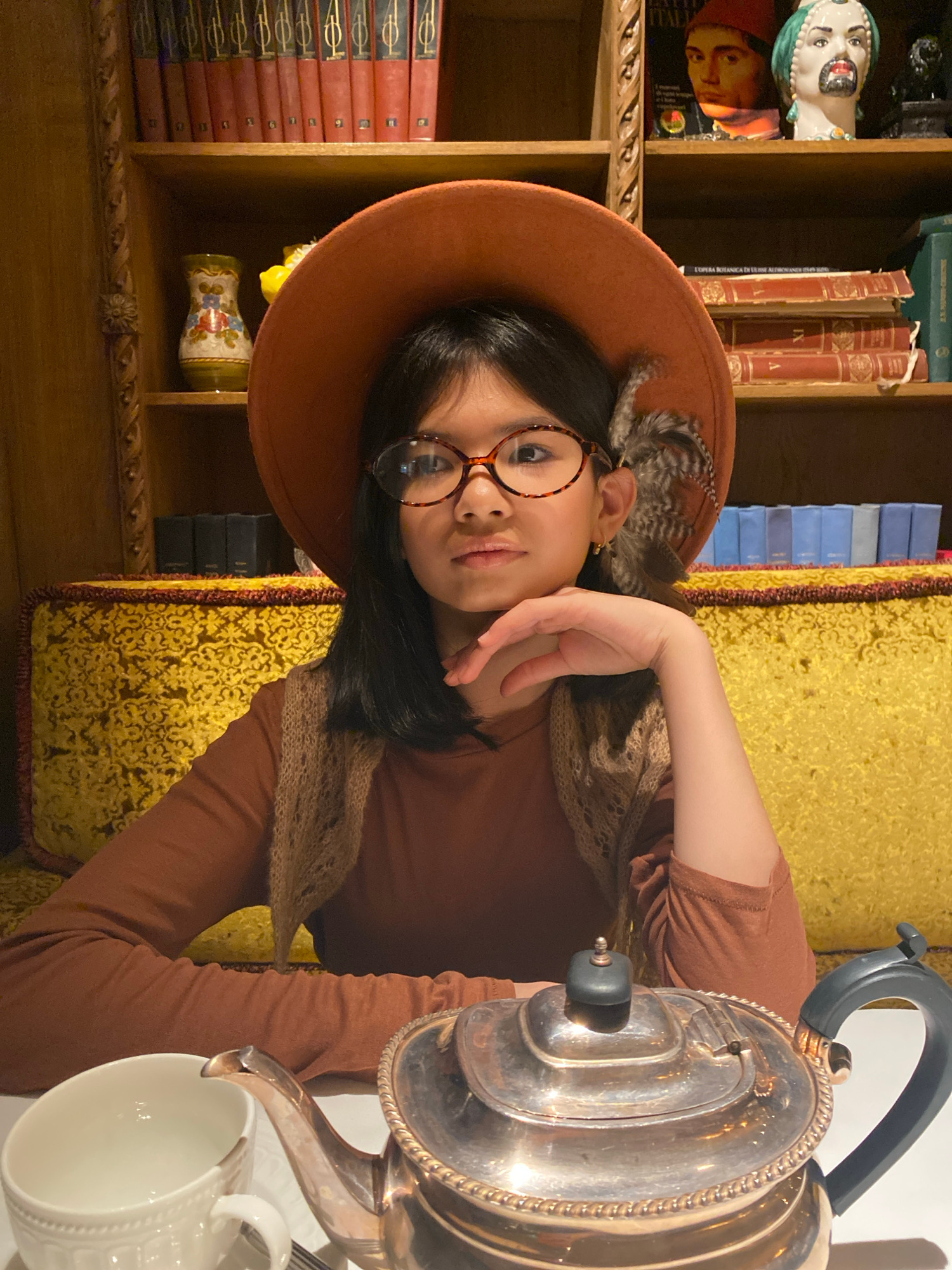 A young person with long dark hair and round tortoise-shell glasses is seated in a cozy, indoor setting, likely in Yekaterinburg, Russia. They wear a rust-colored, wide-brimmed hat adorned with a feat…read more