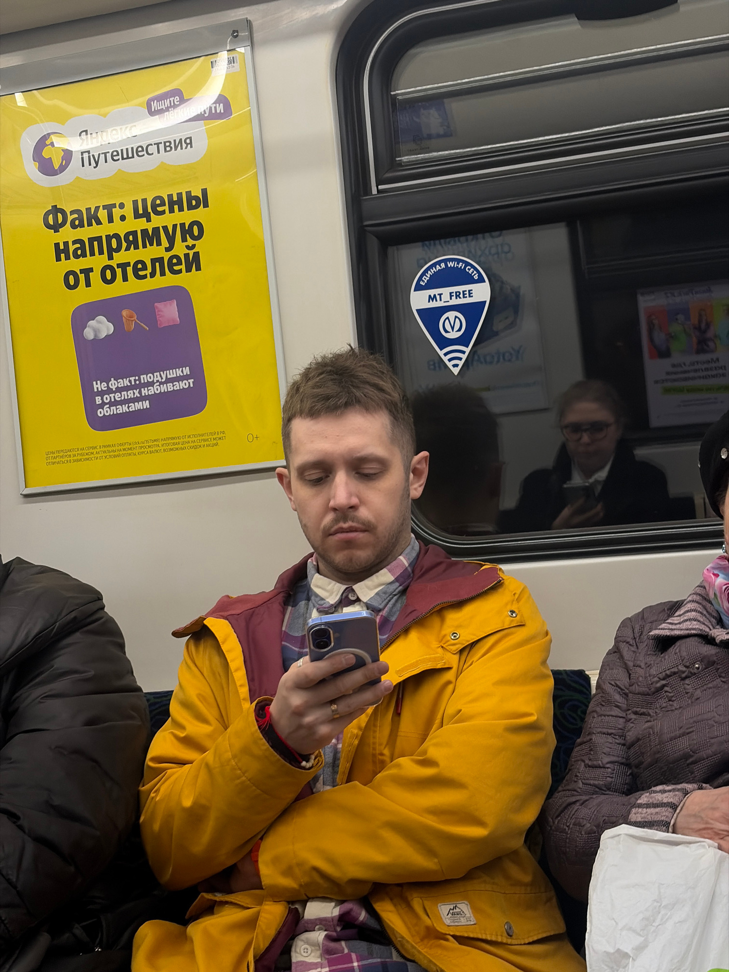 Here is a detailed description of the image: **Scene:** The image appears to be taken inside a public transportation vehicle, likely a subway car or train in Russia, possibly in Saint Petersburg, Ru…read more