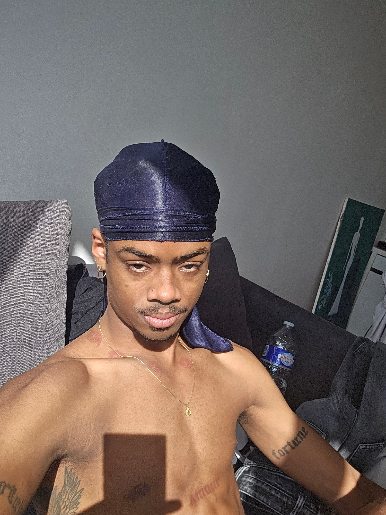 This image, taken in Pantin, France, presents an adult male of dark complexion, captured from the mid-chest upward in an indoor setting. He wears a shiny navy-blue durag and is shirtless. A thin gold…read more