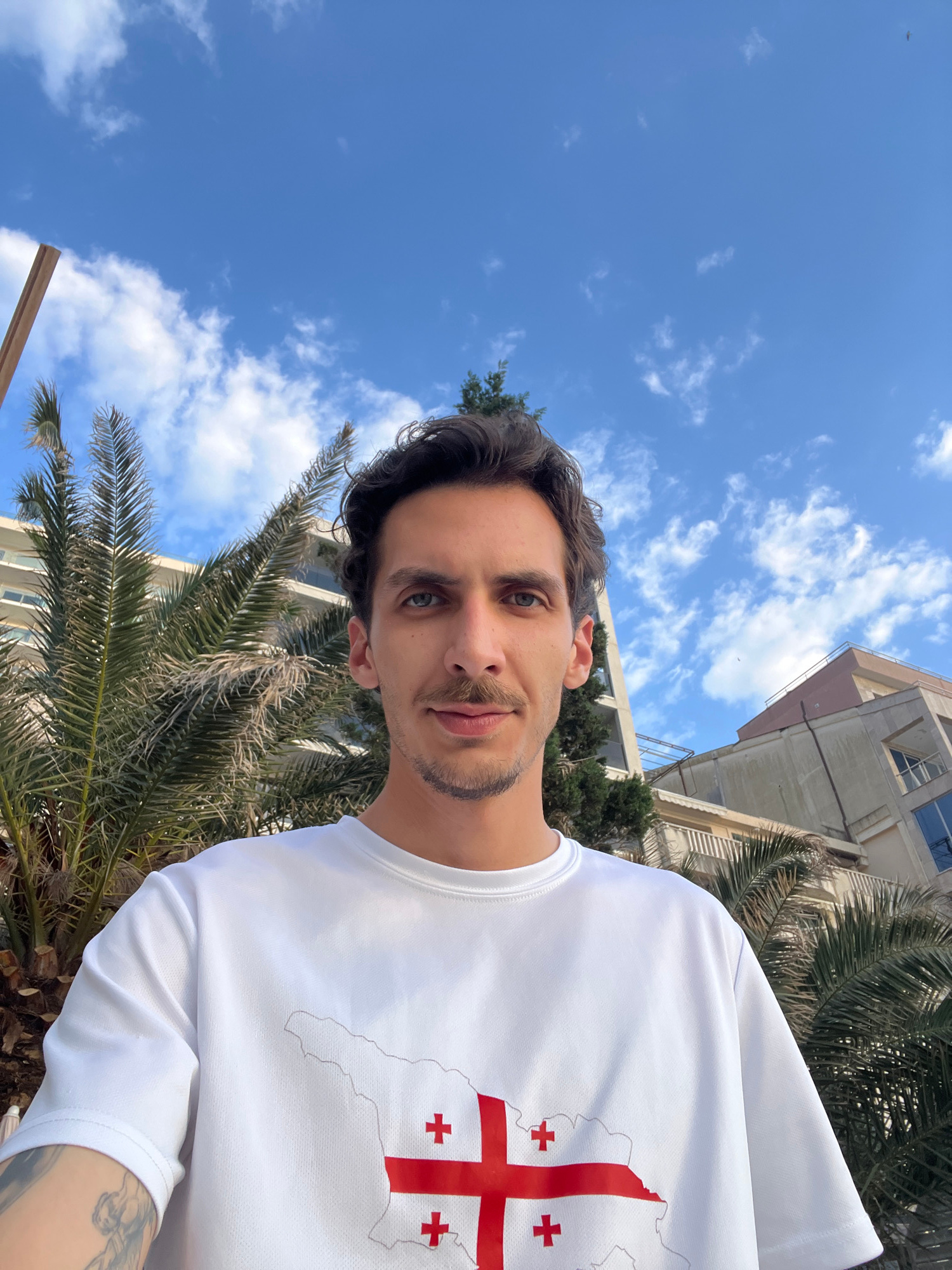 A medium shot captures a person in a white t-shirt emblazoned with the Georgian flag, set against a vibrant backdrop of a clear blue sky dotted with fluffy white clouds and palm trees in Budva, Monten…read more