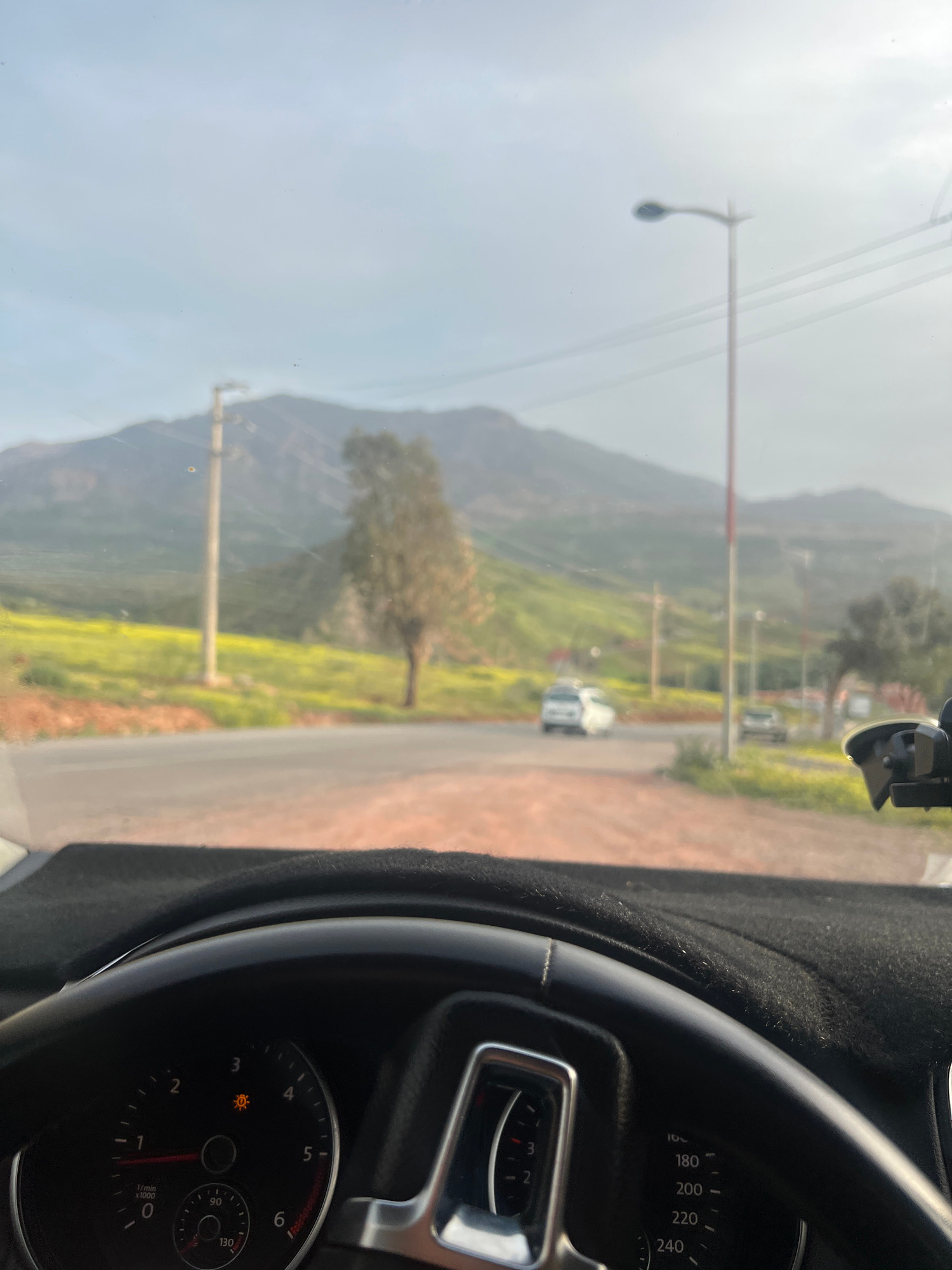 The image is taken from inside a car, showing the steering wheel and dashboard with a view through the windshield of a road winding through a landscape. The dashboard indicates the car is stationary w…read more