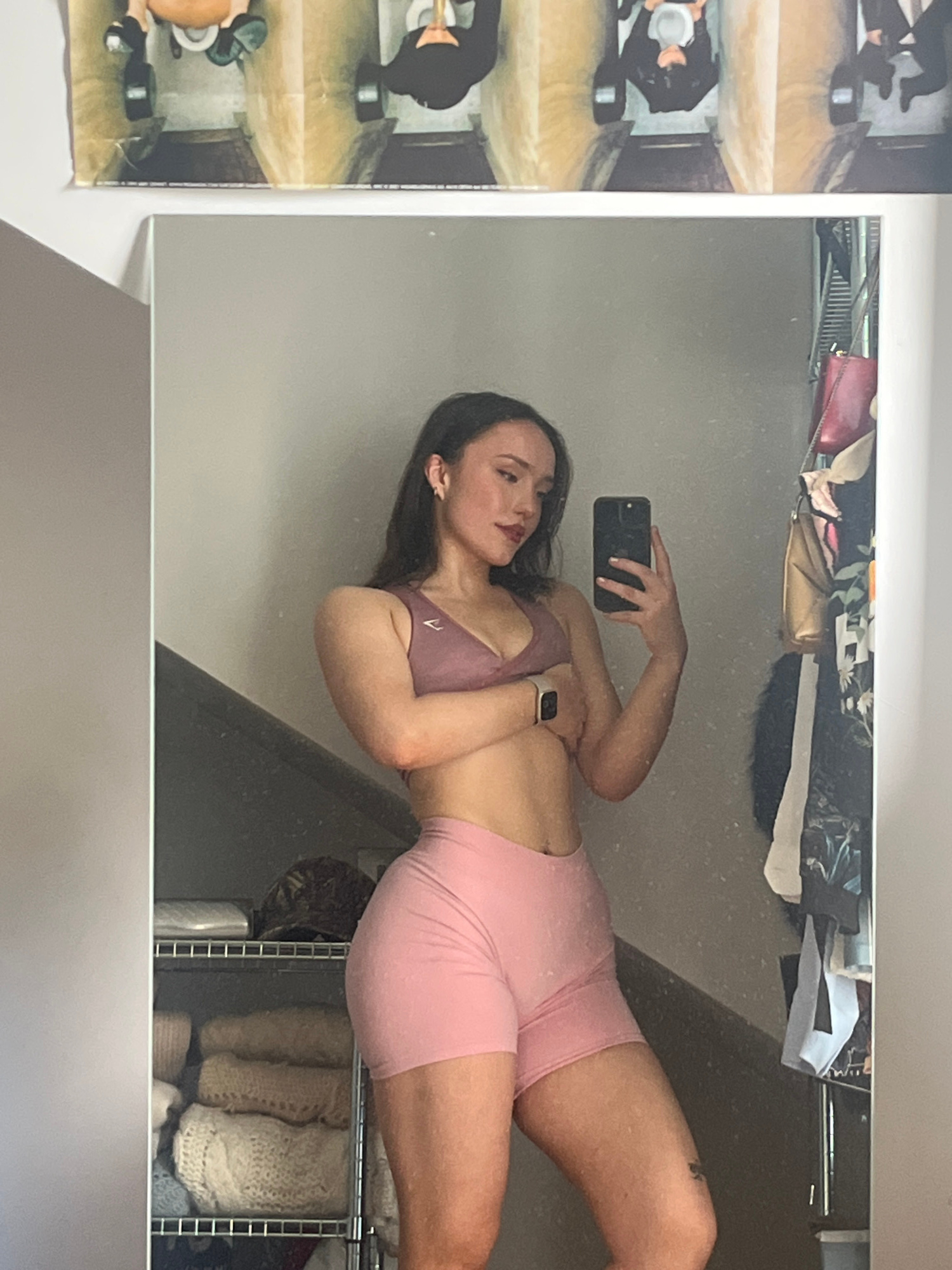 A woman is taking a selfie in a mirror, wearing a pink sports bra and shorts. The reflection in the mirror shows a closet with shelves containing clothes and bags. There is also a photograph or image…read more