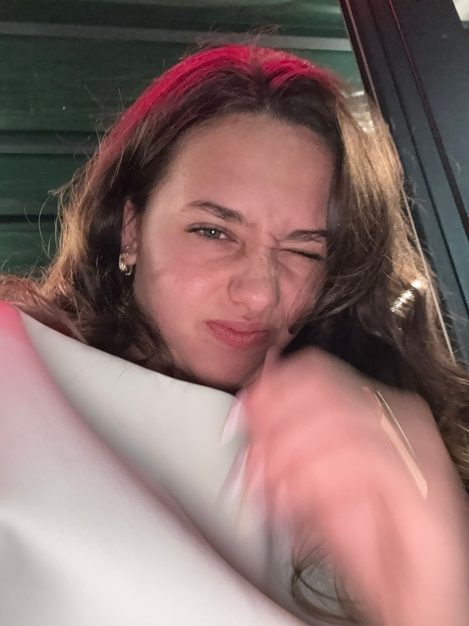 A woman with brown hair, highlighted with red streaks, is positioned in front of a dark green or black corrugated surface with linear patterns. She is wearing earrings and her facial expression is a s…read more
