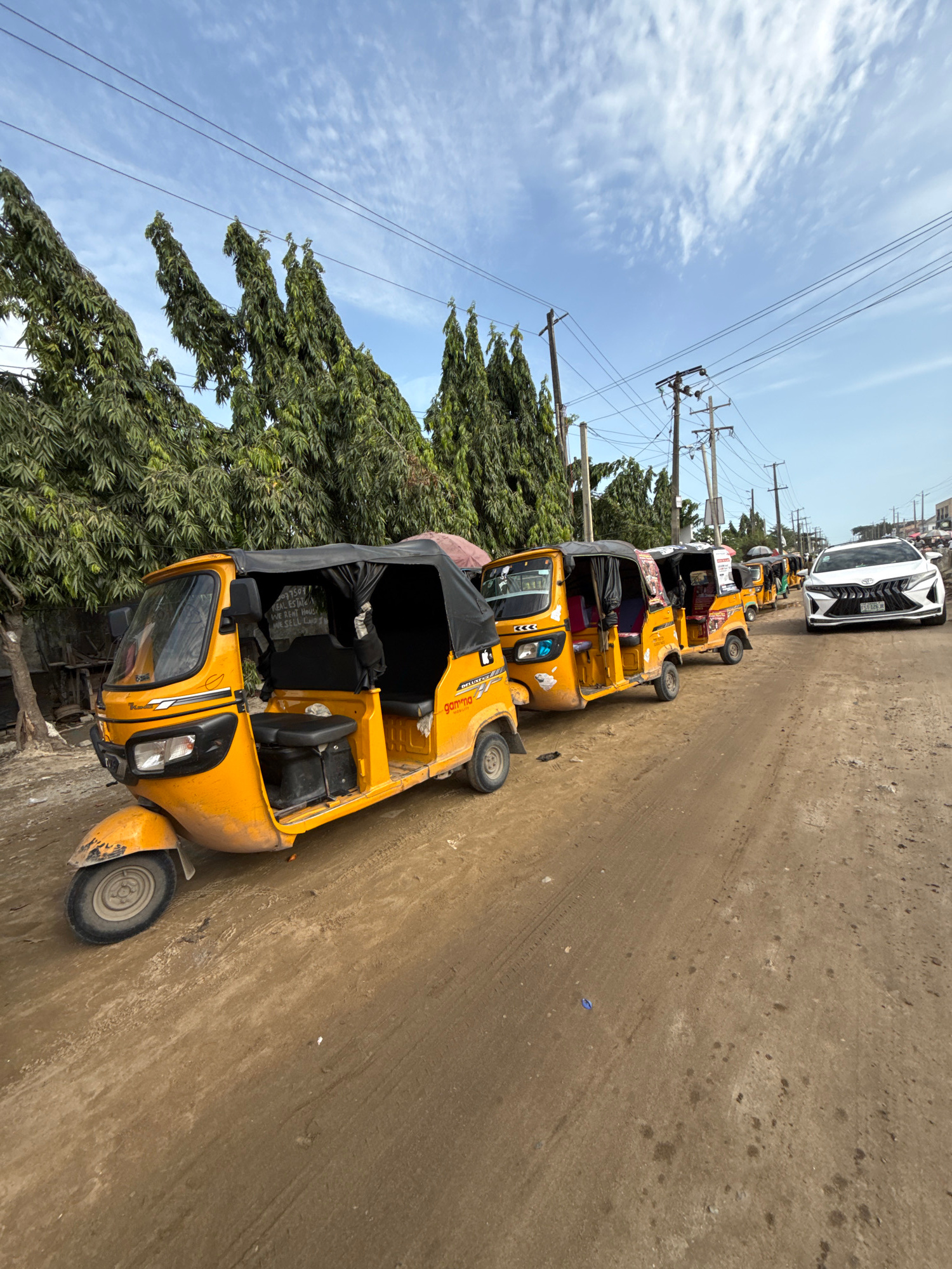 The image depicts a line of yellow "keke napep" auto rickshaws parked on a dirt road in Lekki, Nigeria. A white vehicle is parked further down the road. Power lines are visible overhead, and trees lin…read more