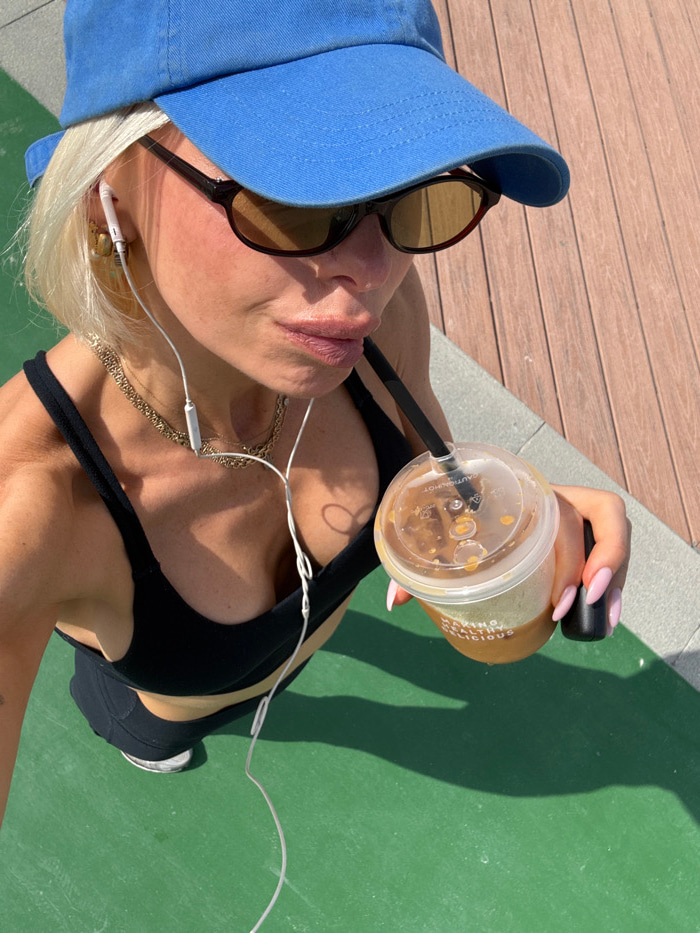 The image depicts a fair-skinned individual in Dubai, United Arab Emirates, captured from an elevated, slightly overhead perspective, likely a selfie. The person has blonde hair, wears a bright blue b…read more