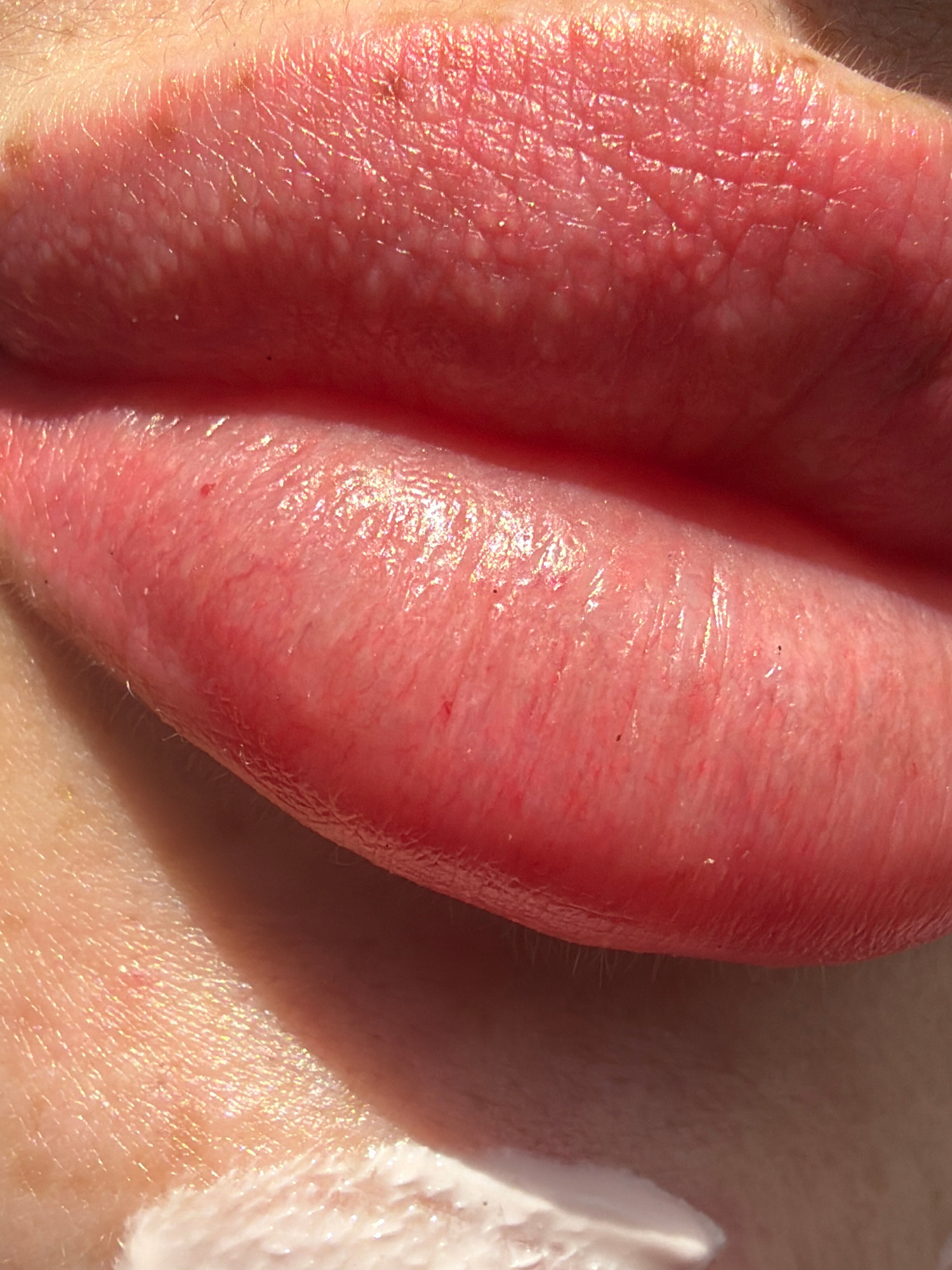 The image shows a close-up of what appears to be human skin, potentially part of a lip or skin fold. The skin is pinkish-red and textured, with visible pores and fine lines. There are small white dots…read more